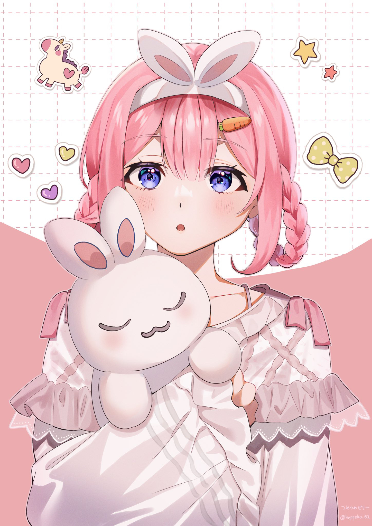 1girl :o animal_ears braid braided_hair_rings collarbone dotted_line dress fake_animal_ears hair_between_eyes hair_rings hairband heart highres hugging_object looking_at_viewer nijisanji parted_lips pink_background pink_hair purple_eyes rabbit_ears sidelocks signature solo star_(symbol) stuffed_animal stuffed_rabbit stuffed_toy suo_sango suo_sango_(2nd_costume) tsumetsume_zerii twin_braids twitter_username two-tone_background upper_body virtual_youtuber white_background white_dress white_hairband
