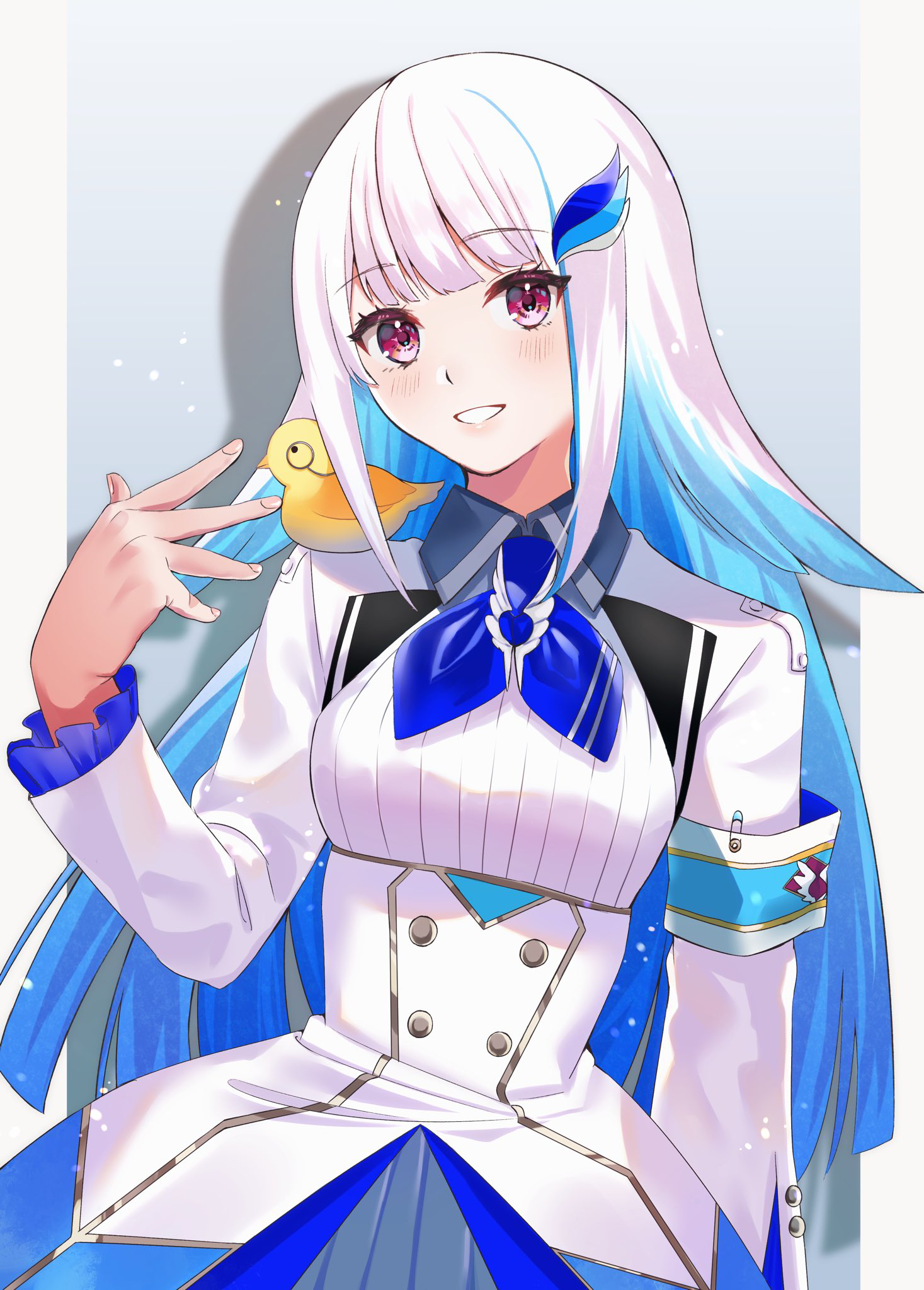 1girl animal animal_on_shoulder bird blue_hair breasts dress duck frilled_sleeves frills grey_skirt hair_ornament hand_up highres lize_helesta lize_helesta_(1st_costume) long_hair long_sleeves monocle multicolored_hair nijisanji pleated_skirt red_eyes sebastian_piyodore skirt small_breasts tsumetsume_zerii two-tone_hair very_long_hair virtual_youtuber white_dress white_hair
