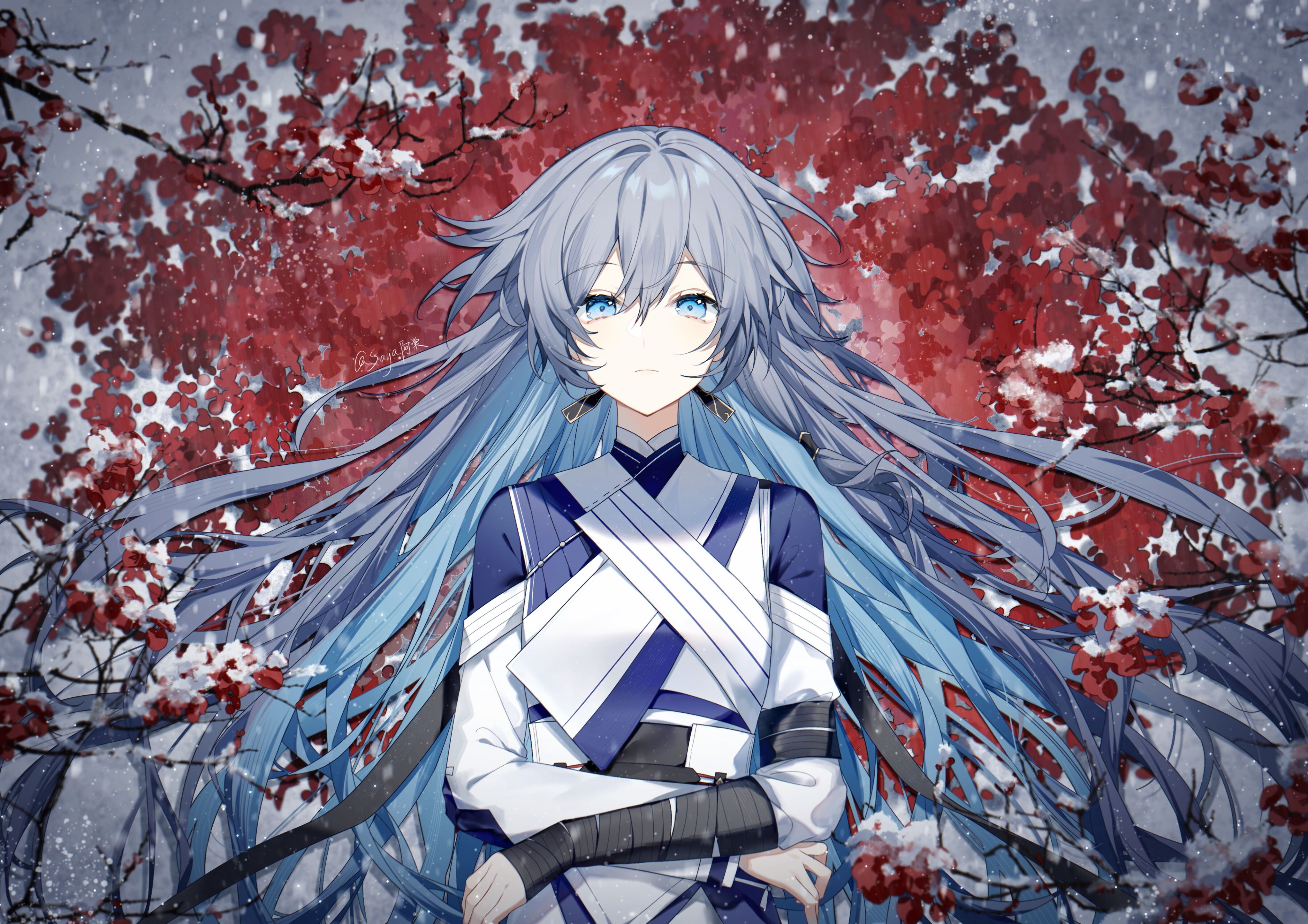 1girl absurdres artist_name blue_eyes branch breasts chinese_clothes chinese_commentary closed_mouth fu_hua fu_hua_(azure_empyrea) fu_hua_(taixuan_impression) grey_hair hair_between_eyes hanfu highres honkai_(series) honkai_impact_3rd long_hair long_sleeves looking_at_viewer lying saya_atang small_breasts snow solo very_long_hair white_hanfu white_sleeves