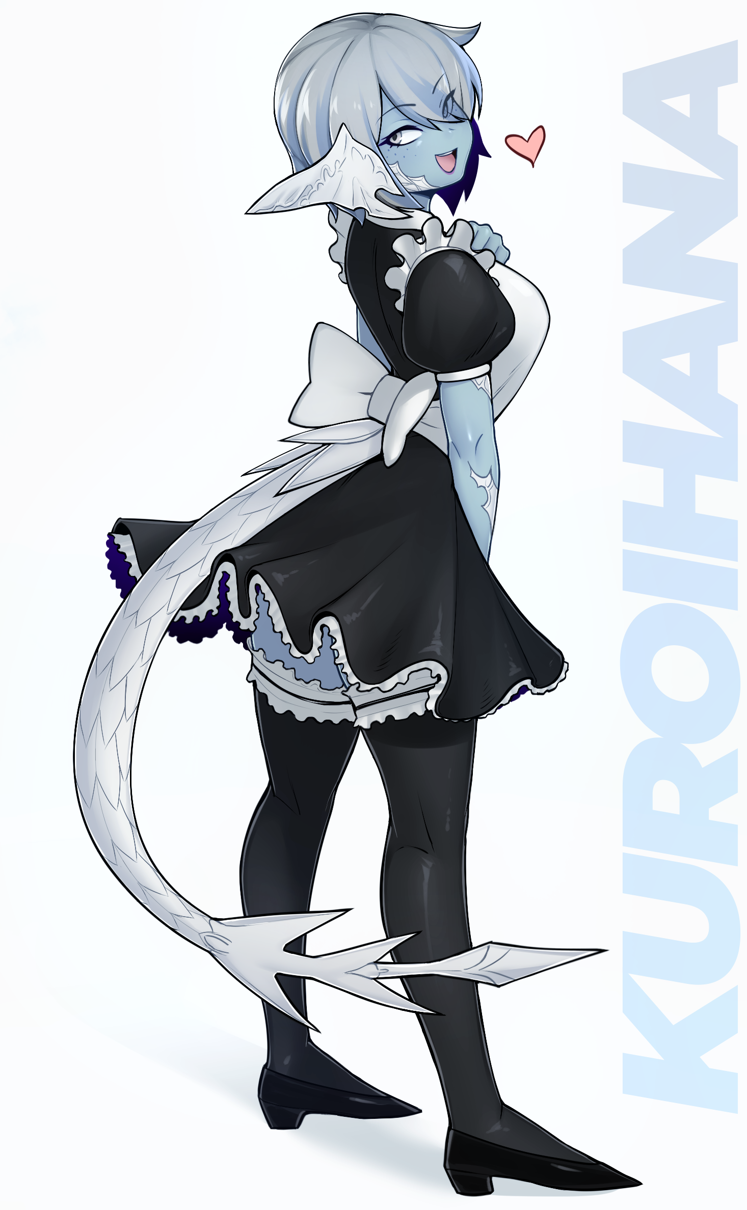 1girl black_footwear black_thighhighs blue_skin blush borrowed_character breasts colored_skin commission d-floe freckles grey_eyes grey_hair heart high_heels highres large_breasts looking_at_viewer maid open_mouth original puffy_short_sleeves puffy_sleeves purple_lips short_hair short_sleeves smile solo tail thighhighs
