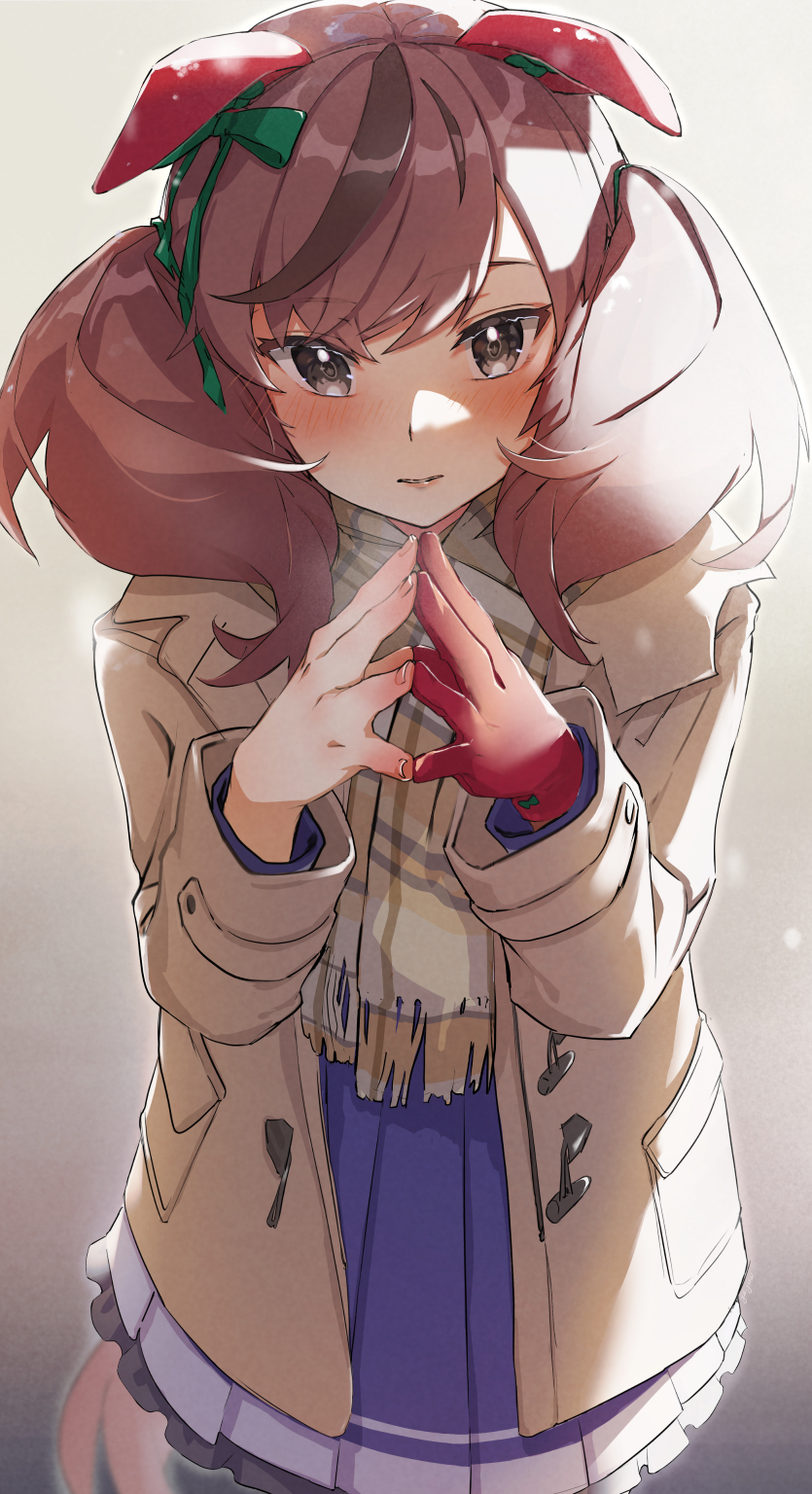 1girl animal_ears blush brown_coat brown_hair closed_mouth coat ear_covers ears_down gloves gradient_background hands_up highres horse_ears horse_girl horse_tail jyakku long_hair long_sleeves looking_at_viewer multicolored_hair nice_nature_(umamusume) open_clothes open_coat own_hands_together purple_skirt red_gloves scarf single_glove skirt solo steepled_fingers streaked_hair tail twintails umamusume upper_body