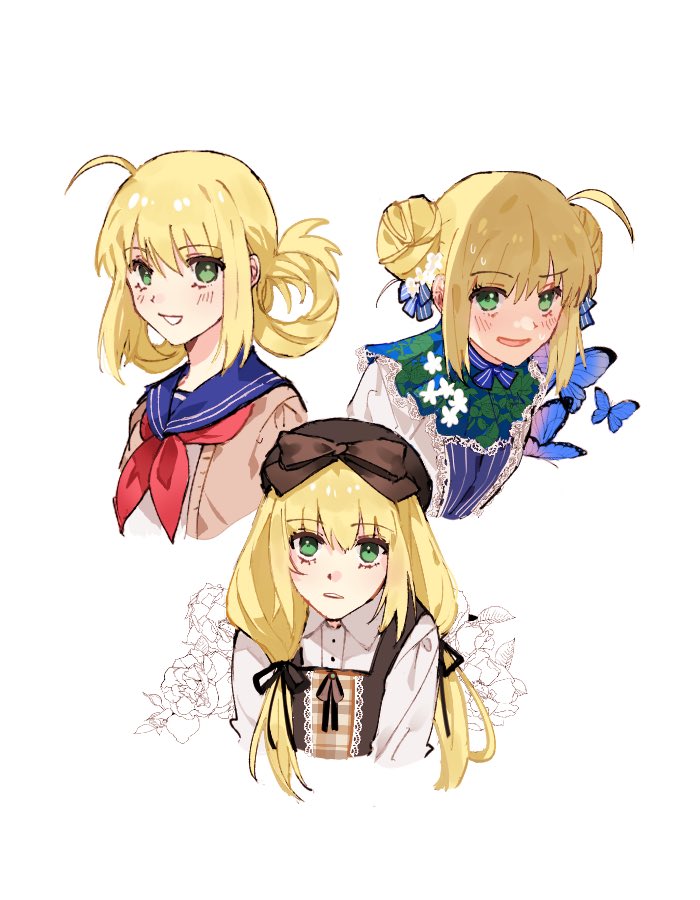 1girl ahoge appleale19 artoria_caster_(fate) artoria_pendragon_(fate) beret black_ribbon blonde_hair blue_ribbon bow braid brown_bow brown_headwear brown_sweater collared_shirt dress fate/grand_order fate_(series) flower green_eyes hair_between_eyes hair_ribbon hat looking_at_viewer multicolored_dress necktie open_mouth ribbon shirt smile sweater twintails white_background white_dress white_flower white_shirt