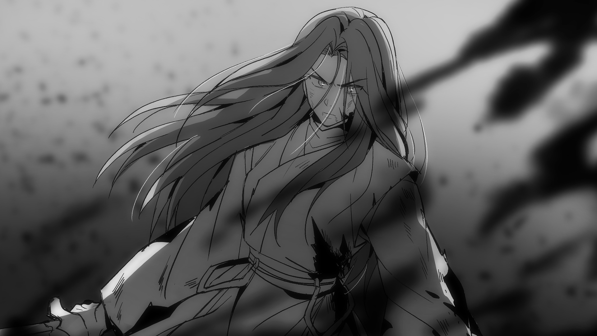 1girl black_hair closed_mouth dirty dirty_clothes dirty_face furrowed_brow grey_background greyscale highres holding holding_sword holding_weapon long_hair long_sleeves looking_at_viewer monochrome return_of_the_mount_hua_sect sash serious solo sword upper_body weapon white_uniform yoruke97 yu_iseol_(return_of_the_mount_hua_sect)
