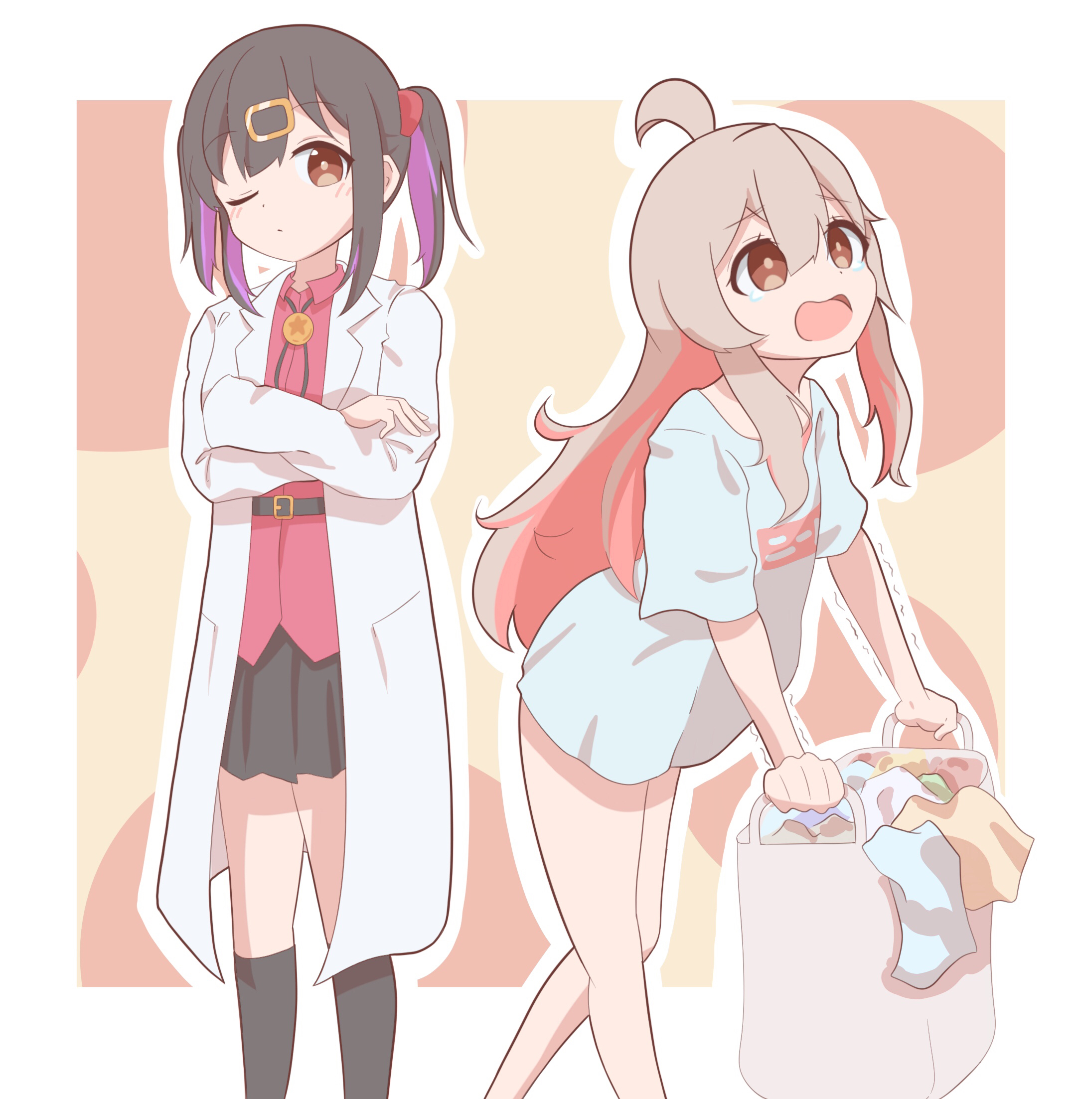 2girls :o ahoge bag bare_legs belt black_hair black_skirt black_socks bolo_tie brown_eyes colored_inner_hair commentary crossed_arms genderswap genderswap_(mtf) grey_hair hair_between_eyes hair_ornament hairclip heavy highres holding holding_bag kneehighs kokoaalala33 lab_coat long_hair long_sleeves looking_at_viewer medium_hair multicolored_hair multiple_girls no_pants one_eye_closed onii-chan_wa_oshimai! open_mouth outline oyama_mahiro oyama_mihari pink_hair purple_hair red_shirt shirt short_sleeves siblings simple_background sisters skirt socks t-shirt tears trembling twintails two-tone_hair untucked_shirt white_outline white_shirt