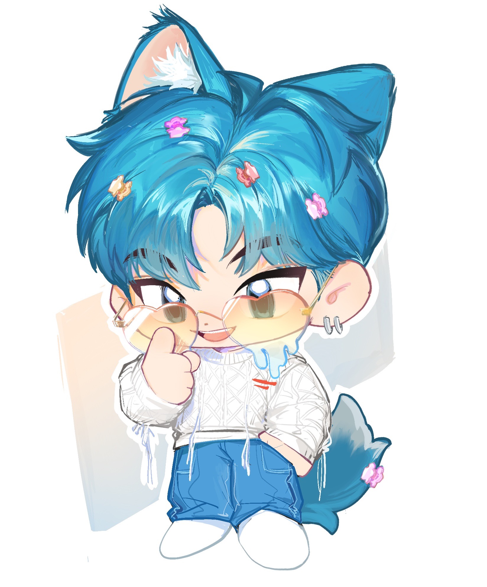 1boy adjusting_eyewear animal_ears animification ben9. bishounen blue_eyes blue_hair cat_boy cat_ears cat_tail denim earrings extra_ears finger_on_eyewear full_body hand_in_pocket heart heart-shaped_eyewear highres hoop_earrings jeans jewelry k-pop male_focus pants real_life simple_background solo sweater tail tempest_(k-pop_group) white_background white_footwear white_sweater