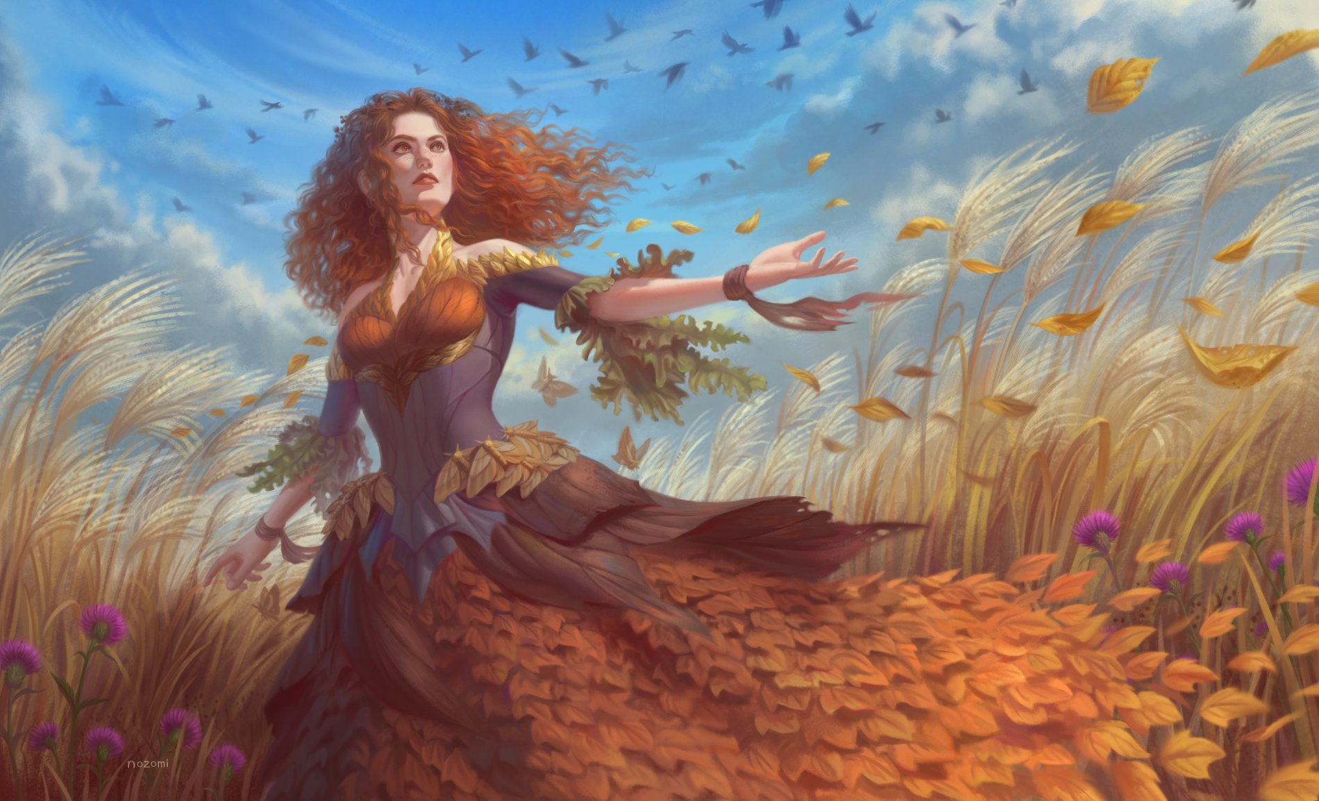 1girl artist_name autumn autumn_leaves bare_shoulders bird blue_sky bug cloud cloudy_sky curly_hair dress flower frilled_dress frills highres insect leaf long_hair looking_afar maple_leaf moth multicolored_clothes nature nozomi-mats original outdoors outstretched_arm purple_flower red_hair sky wheat_field wind wristband