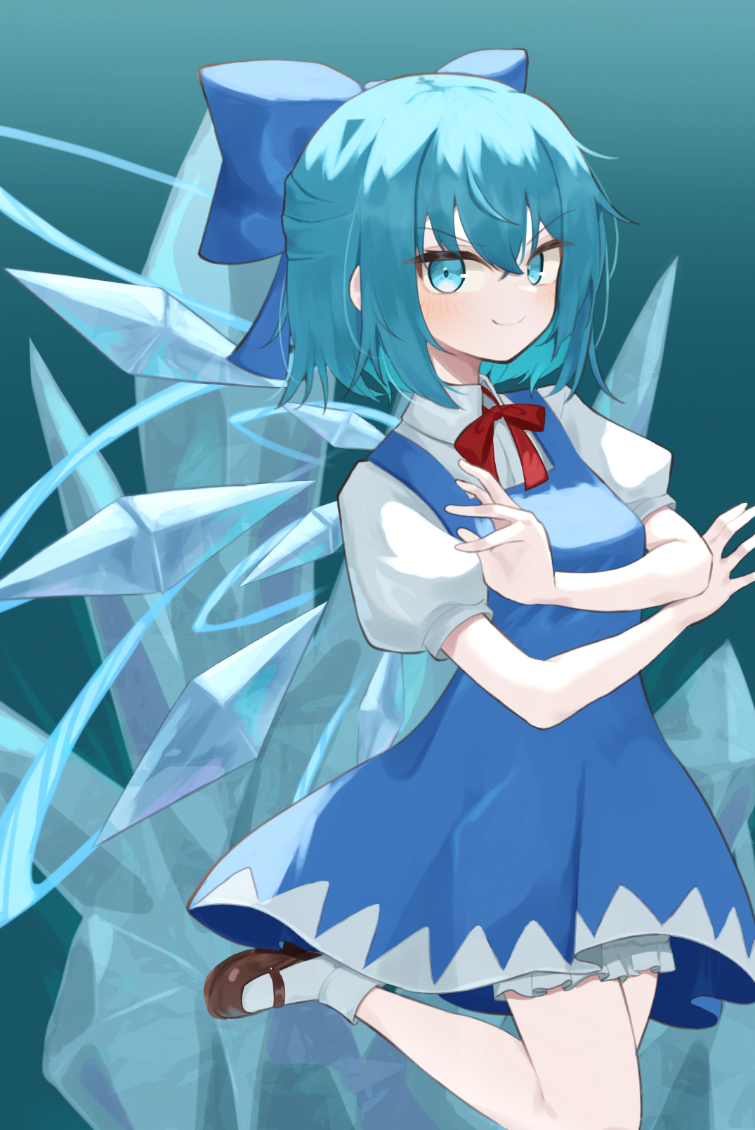 1girl bloomers blue_background blue_eyes blue_hair bow breasts cirno dress foot_out_of_frame gradient_background hair_bow highres ice ice_wings mary_janes medium_breasts shino2121 shoes simple_background smile socks solo standing standing_on_one_leg touhou underwear v-shaped_eyebrows wings