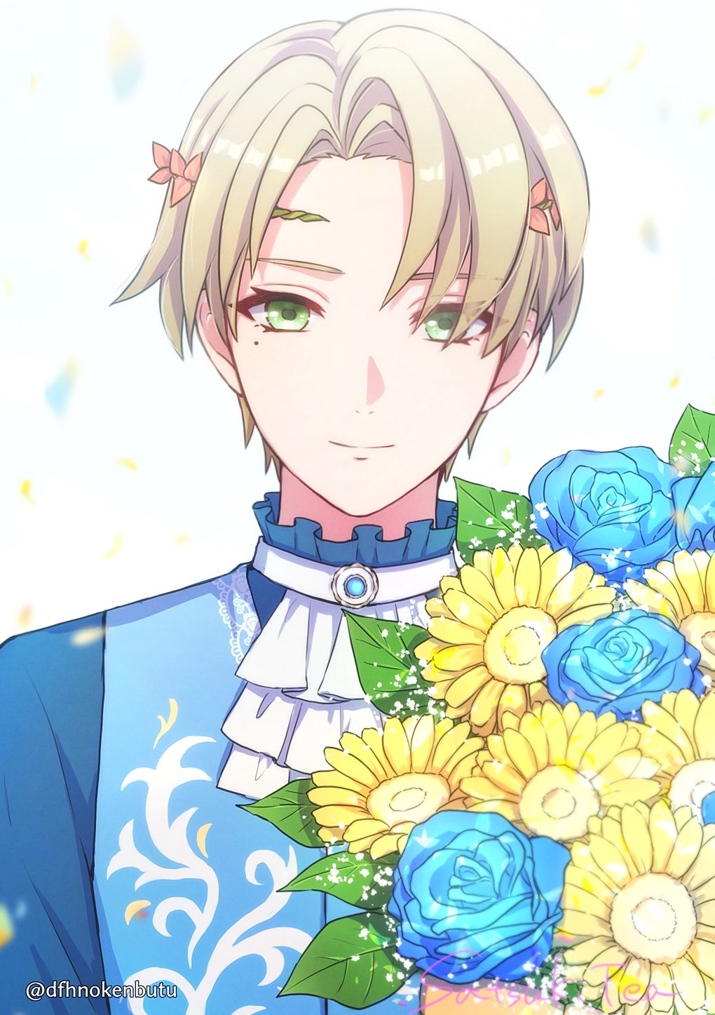 1boy alfred_(fire_emblem) ascot blonde_hair blue_shirt circlet closed_mouth dfhnokenbutu fire_emblem fire_emblem_engage flower green_eyes highres holding holding_flower looking_at_viewer male_focus mole mole_under_eye nintendo shirt short_hair solo white_ascot white_background