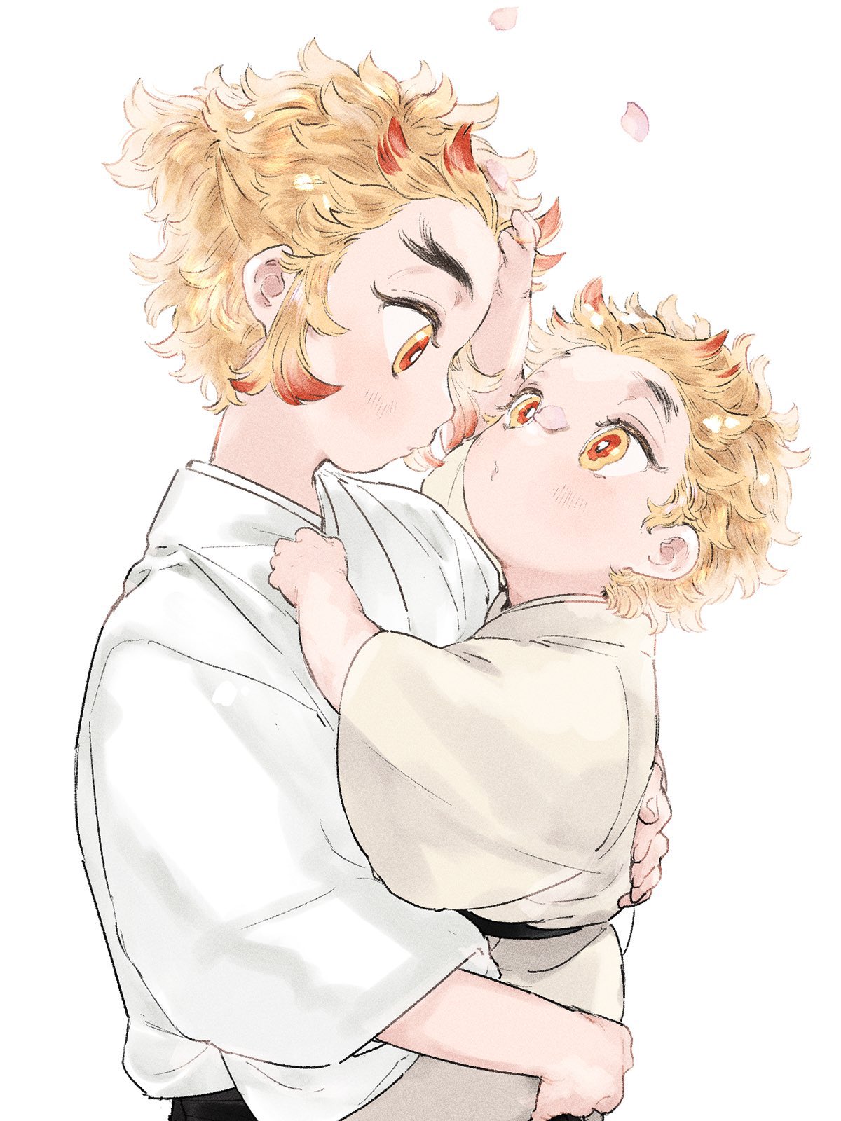 2boys aged_down arm_up blonde_hair blowing brothers carrying child child_carry colored_tips falling_petals forked_eyebrows hakama hand_on_another's_back hand_on_another's_head highres japanese_clothes kimetsu_no_yaiba kimono long_sleeves looking_at_another looking_away looking_up male_focus multicolored_eyes multicolored_hair multiple_boys ohagigaumai petal_on_nose petals profile puckered_lips red_eyes red_hair rengoku_kyoujurou rengoku_senjurou sash short_hair siblings simple_background streaked_hair white_background white_kimono yellow_eyes