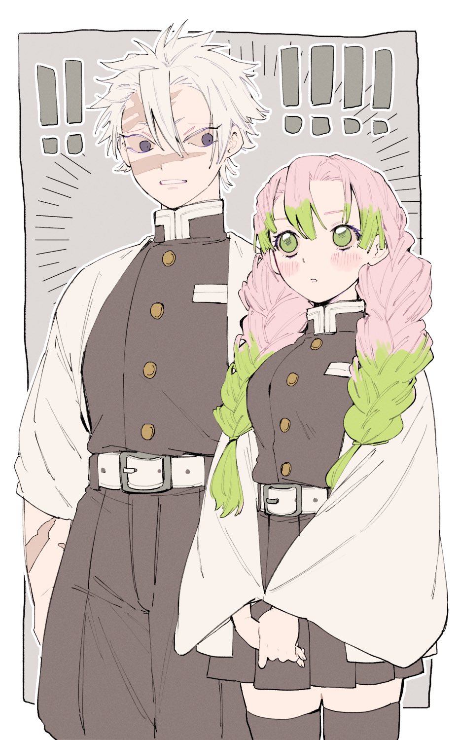 ! !! 1boy 1girl :o belt black_jacket black_skirt black_thighhighs blush braid breasts cowboy_shot demon_slayer_uniform green_eyes green_hair green_thighhighs grey_hair highres jacket kanroji_mitsuri kimetsu_no_yaiba long_hair long_sleeves looking_at_another medium_breasts miniskirt multicolored_hair ohagigaumai own_hands_together pink_hair pleated_skirt purple_eyes ribbed_thighhighs scar scar_on_arm scar_on_face scar_on_forehead scar_on_nose shinazugawa_sanemi shirt short_hair skirt skirt_set surprised thighhighs twin_braids two-tone_hair waraji white_jacket white_shirt wide_sleeves zettai_ryouiki