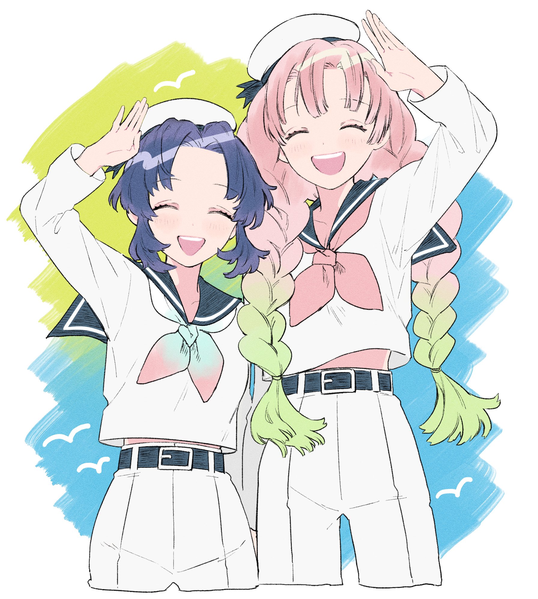 2girls ^_^ alternate_costume arm_up belt blue_hair braid closed_eyes cropped_legs facing_viewer gradient_hair gradient_neckerchief green_hair happy hat highres kanroji_mitsuri kimetsu_no_yaiba kochou_shinobu long_hair long_sleeves midriff_peek mole mole_under_eye multicolored_hair multiple_girls neckerchief ohagigaumai open_mouth pants parted_bangs pink_hair pink_neckerchief pleated_pants sailor_collar sailor_hat sailor_shirt salute shirt sidelocks smile twin_braids two-tone_hair white_background white_headwear white_pants white_shirt