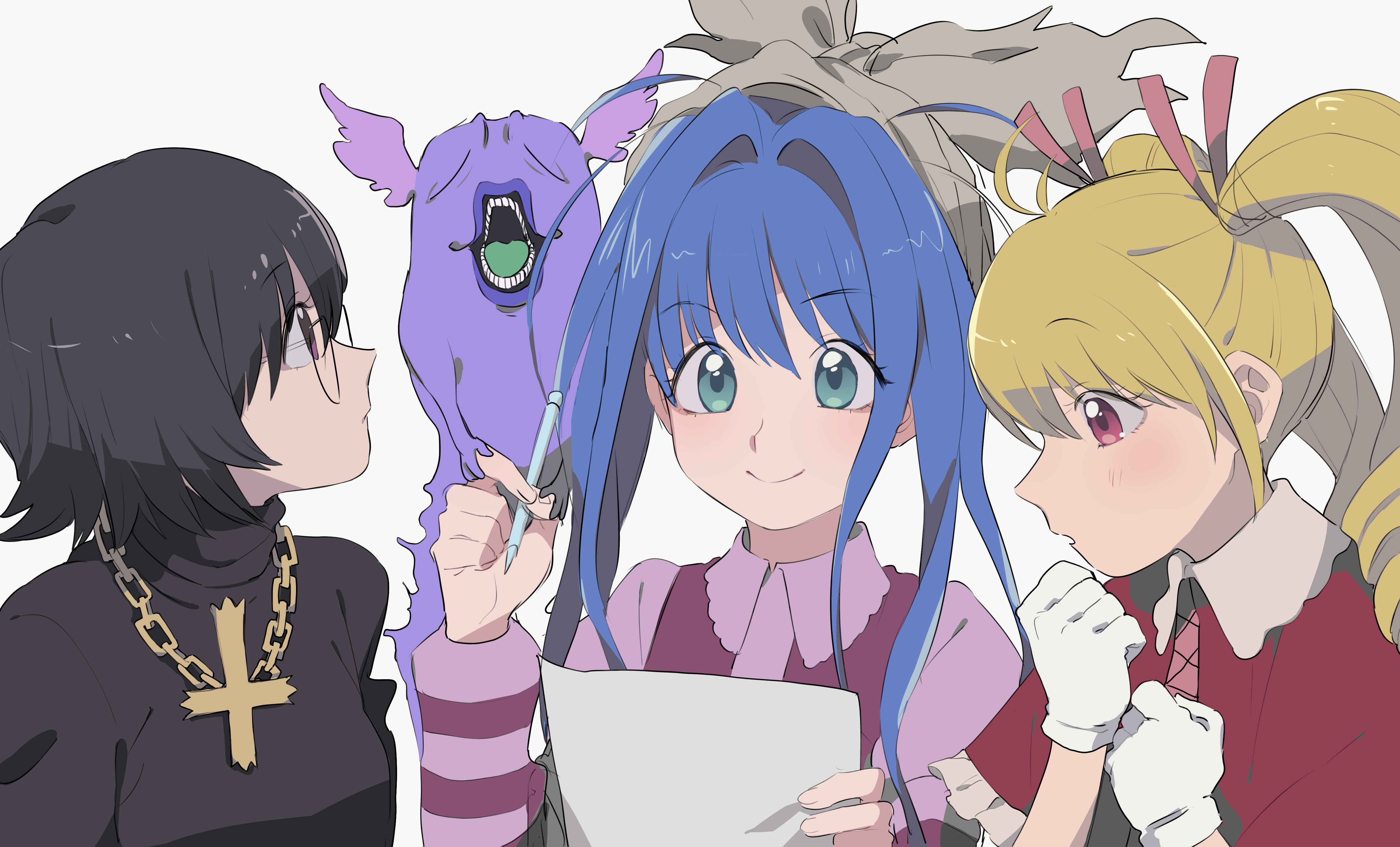 3girls absurdres biscuit_krueger black_hair blonde_hair blue_hair chain chain_necklace closed_mouth cross cross_necklace glasses gloves highres holding holding_pen hunter_x_hunter jewelry kojirou_(kojirou_sousaku) long_hair monster multiple_girls necklace neon_nostrade open_mouth pen shizuku_murasaki simple_background smile twintails upper_body white_gloves