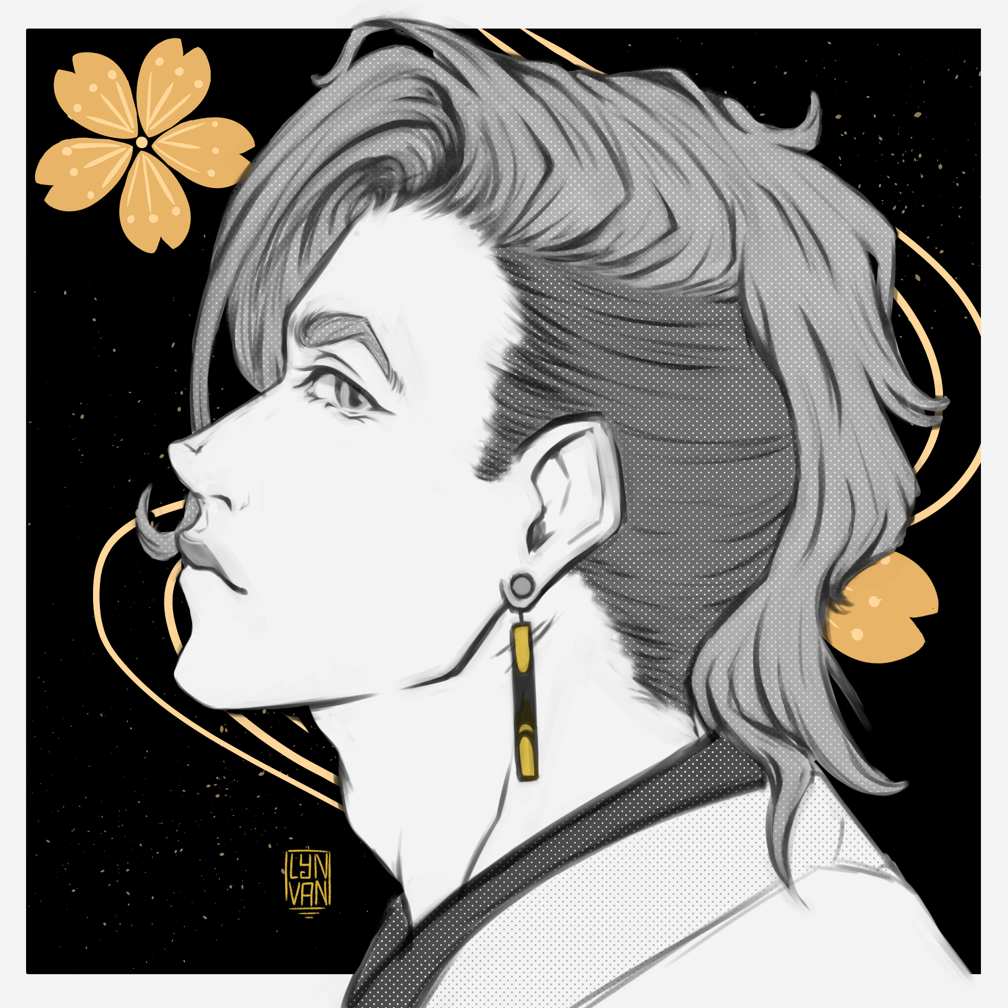 1boy artist_name black_background earrings grey_hair highres jewelry lynvan medium_hair portrait profile revenger solo usui_yuen