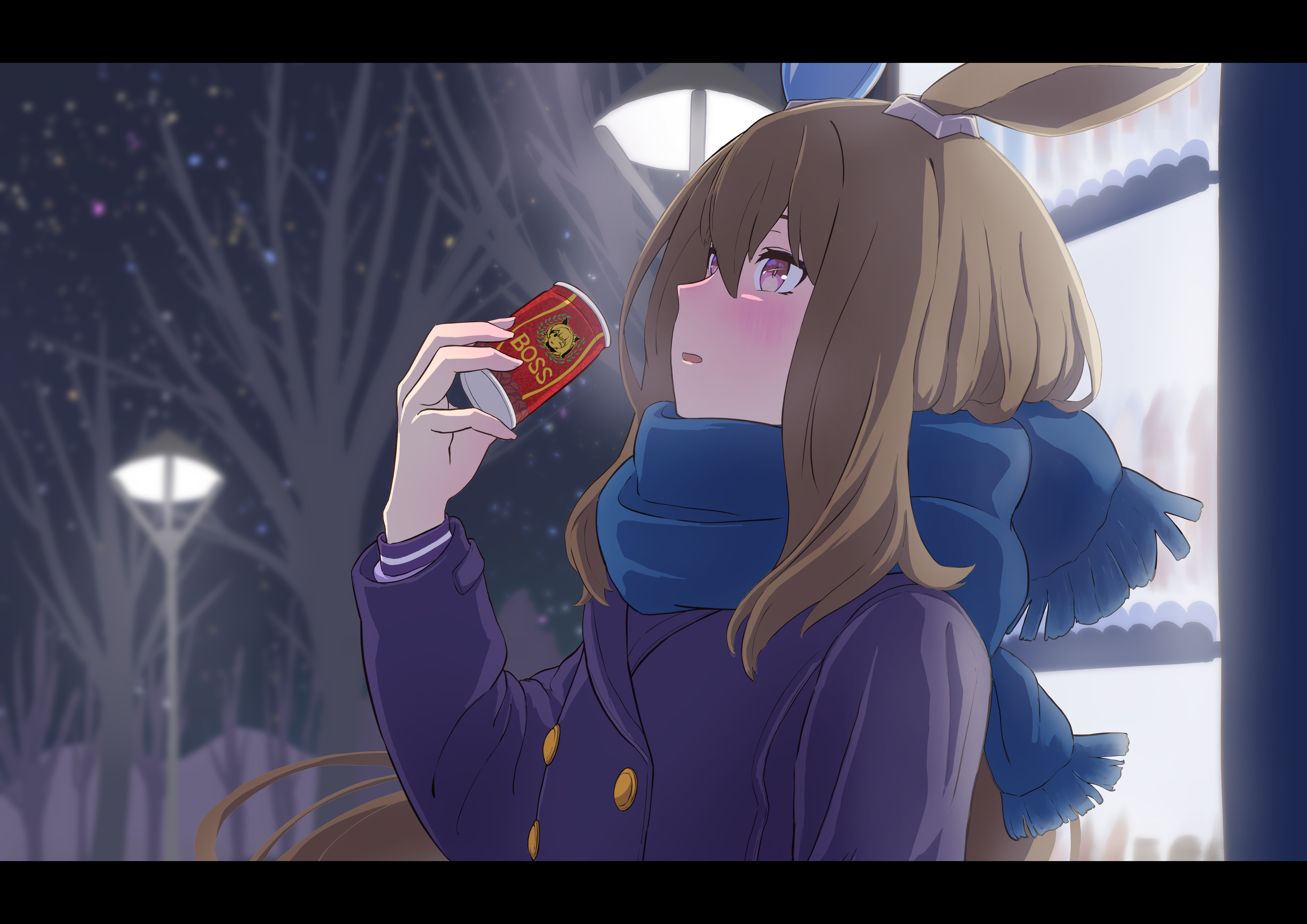 1girl absurdres admire_vega_(umamusume) agepan._(pangcha3324) animal_ears blue_scarf blush boss_coffee brown_hair buttons can curren_chan_(umamusume) double-breasted ear_covers from_side hair_between_eyes highres holding holding_can horse_ears horse_girl long_hair long_sleeves looking_up low_ponytail ponytail purple_eyes scarf school_uniform single_ear_cover solo suntory tracen_school_uniform tracen_winter_coat umamusume vending_machine