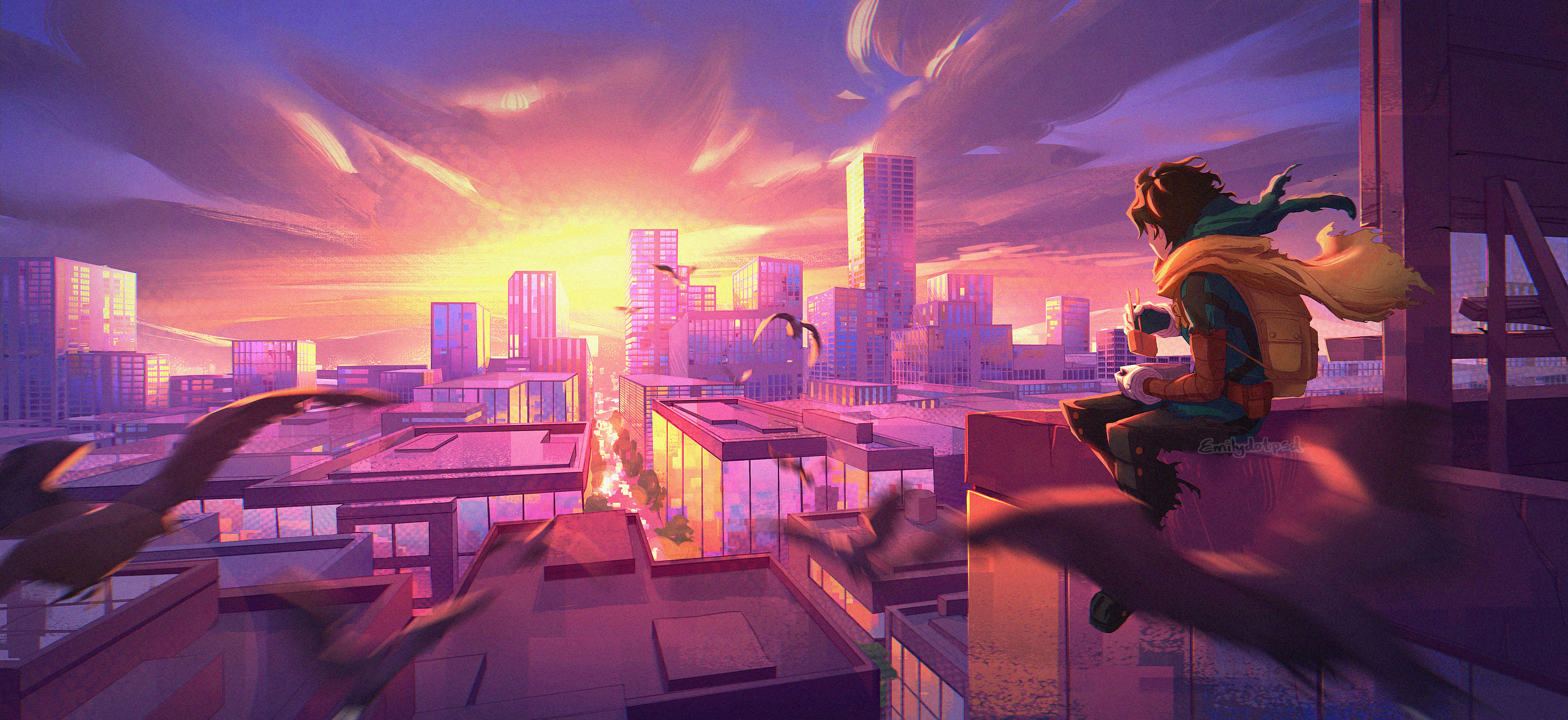 1boy absurdres artstation_username backlighting backpack bag belt_pouch billboard bird black_bird bodysuit boku_no_hero_academia box building cape chopsticks chromatic_aberration cityscape cloud cloudy_sky commentary emily_ooi english_commentary evening film_grain floating_cape floating_hair foot_dangle foreshortening from_side gloves gradient_sky green_bodysuit green_gloves green_hair green_mask halftone highres holding holding_box holding_chopsticks instagram_username katsu_(food) lens_flare light looking_to_the_side lunchbox male_focus midoriya_izuku motion_blur outdoors perspective pink_sky pouch purple_sky road short_hair sitting sky skyscraper solo street sunlight sunset torn_cape torn_clothes torn_sleeve twitter_username urban vanishing_point white_gloves wide_shot wind yellow_bag yellow_cape yellow_sky
