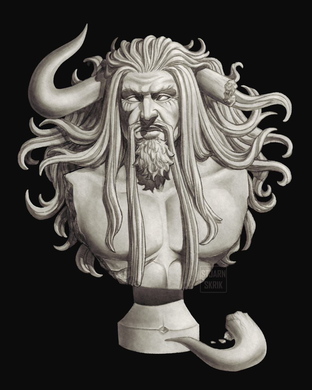 1boy beard black_background broken_horn closed_mouth curled_horns facial_hair highres horns kaidou_(one_piece) large_pectorals long_hair looking_at_viewer male_focus mature_male mustache no_hands no_pupils one_piece pectorals scar scar_on_stomach solo statue stjarnskrik topless_male upper_body wrinkled_skin