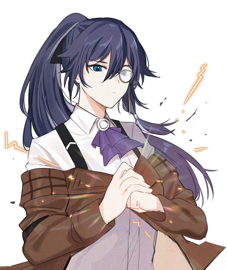 1girl 3o_c black_hair blue_eyes brown_coat closed_mouth coat collared_shirt detective fu_hua fu_hua_(valkyrie_accipiter) honkai_(series) honkai_impact_3rd long_hair long_sleeves looking_at_viewer monocle ponytail shirt simple_background solo upper_body white_background white_shirt