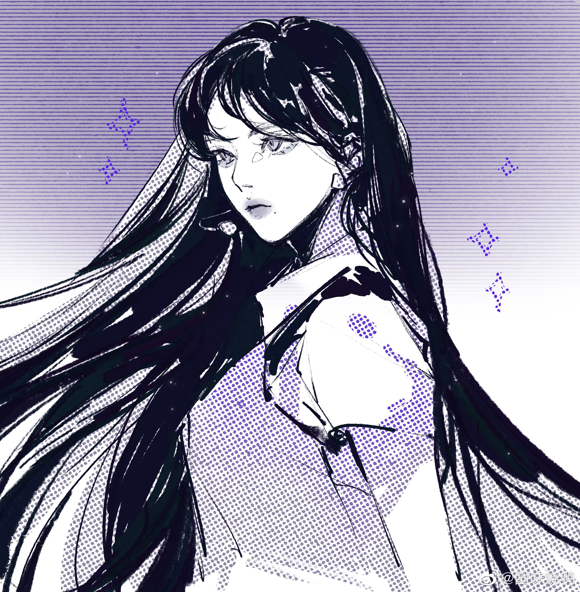 1girl aespa animification breasts chinese_commentary collared_shirt earpiece earrings expressionless floating_hair from_side halftone highres jewelry k-pop karina_(aespa) long_hair medium_breasts mole mole_under_eye monochrome purple_theme real_life shirt solo sparkle very_long_hair watermark weibo_watermark yuanwei_shaoya