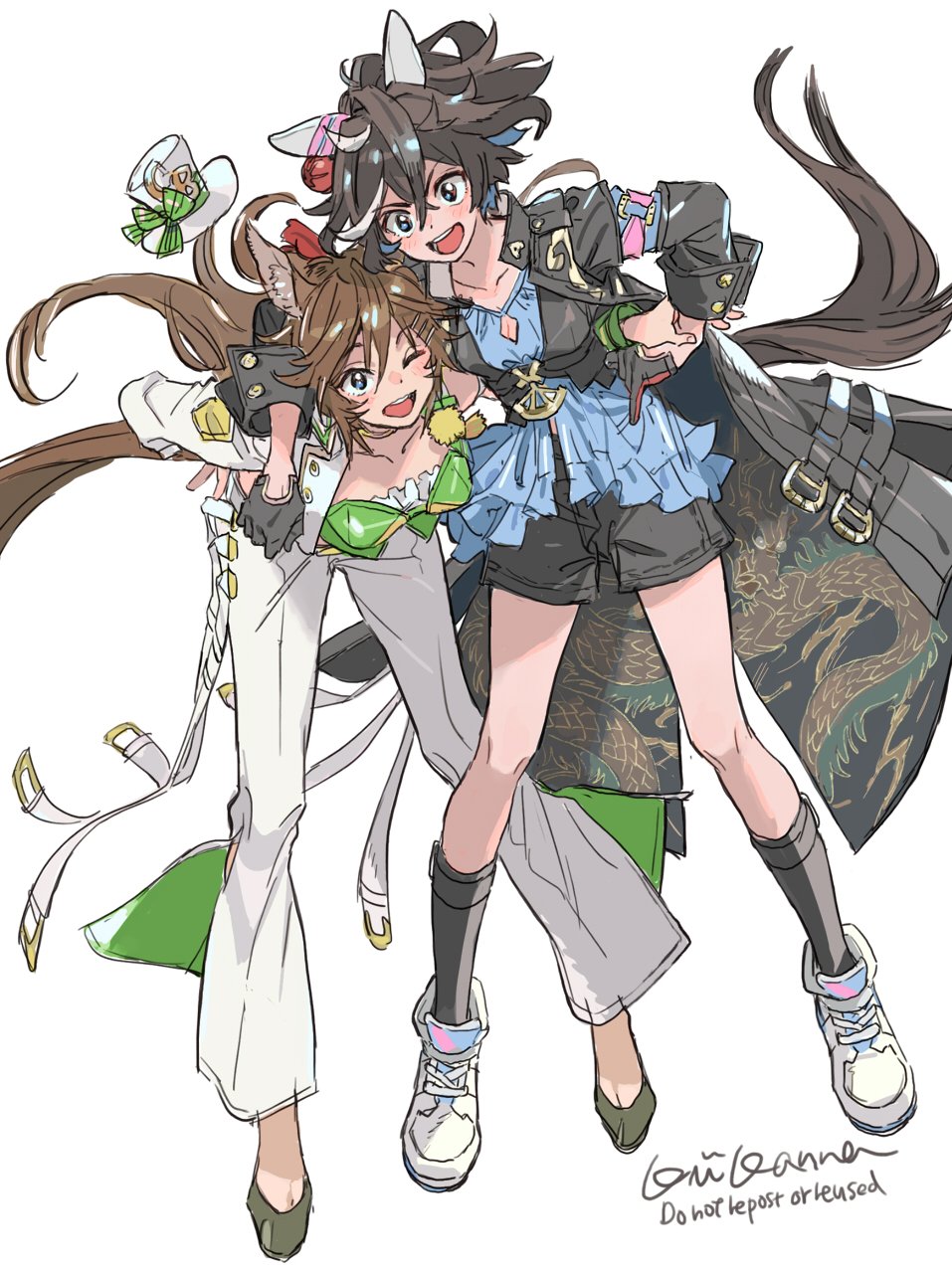 2girls animal_ears hat highres horse_ears horse_girl horse_tail jacket kiikanna multiple_girls one_eye_closed shorts tail umamusume white_background