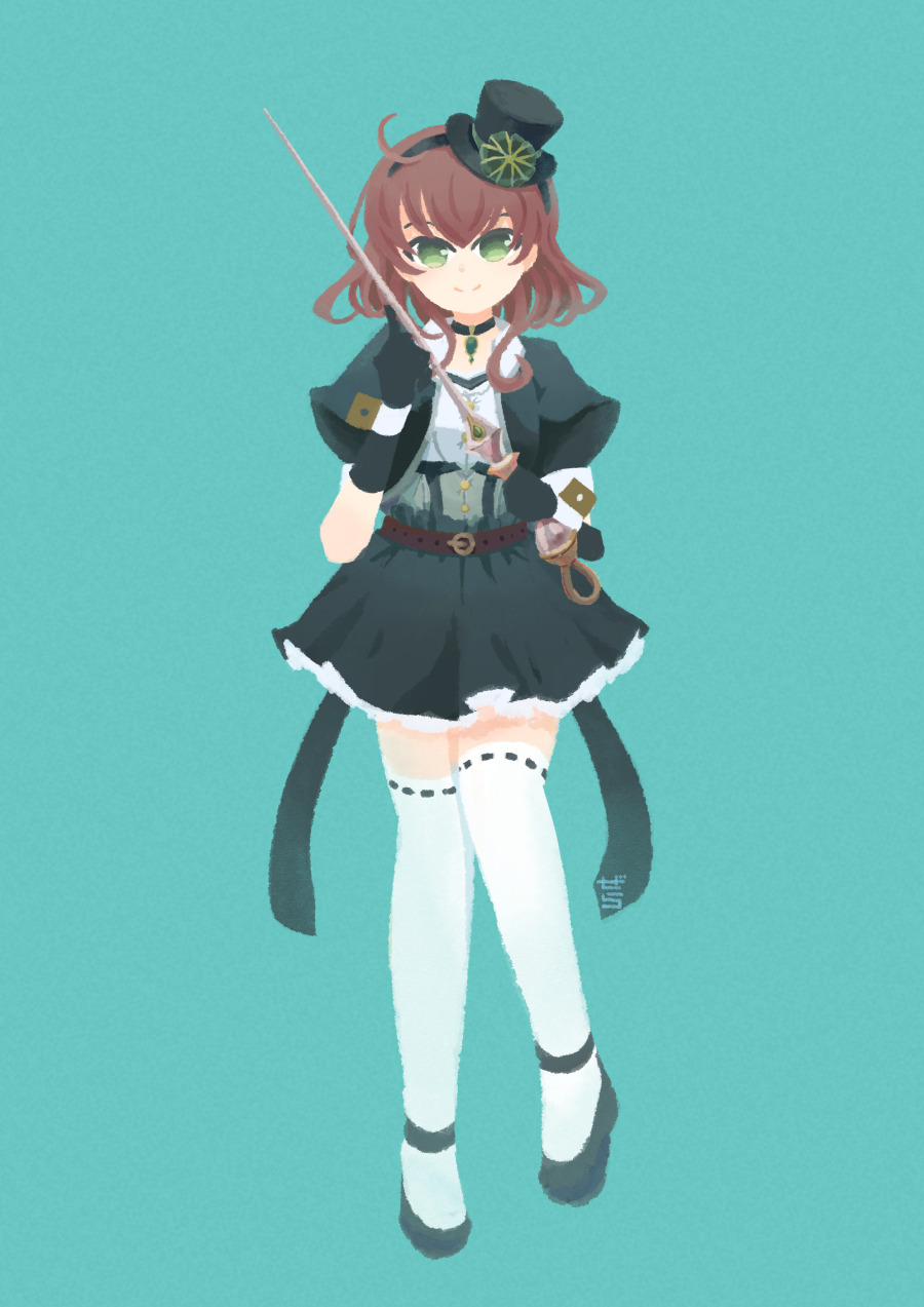 1girl ahoge aqua_background artist_name back_bow belt bow brown_belt brown_hair choker closed_mouth cropped_jacket culottes dot_nose full_body gera-magia gloves green_choker green_eyes green_gloves green_hairband green_headwear green_jacket green_shoes green_shorts hairband hands_up hat heel_up highres holding holding_sword holding_weapon jacket layered_shorts looking_at_viewer magia_record:_mahou_shoujo_madoka_magica_gaiden magical_girl mahou_shoujo_madoka_magica mary_janes medium_hair mini_hat open_clothes open_jacket pendant_choker ribbon-trimmed_thighhighs ribbon_trim shirt shoes shorts simple_background sleeve_cuffs smile solo split_mouth standing sword thighhighs top_hat underbust weapon white_shirt white_thighhighs wrist_cuffs yayoi_kanoko zettai_ryouiki