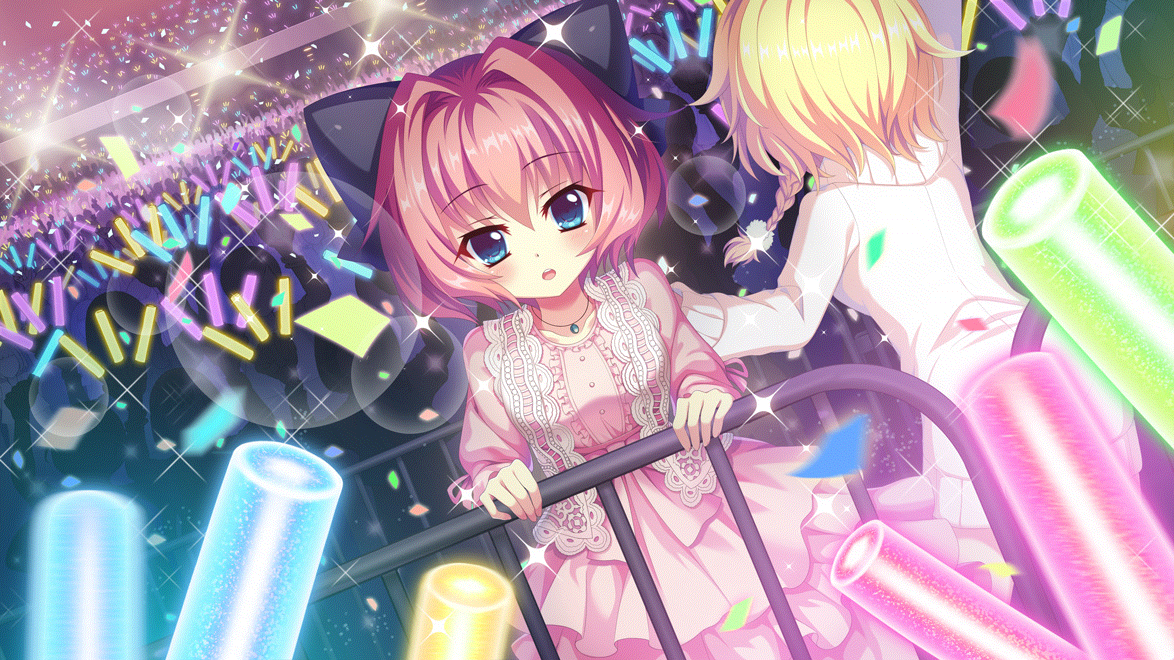 2girls against_railing arm_up black_bow blonde_hair blue_eyes bow braid breasts collarbone confetti crowd dot_nose dress film_grain game_cg glowstick hair_bow hair_intakes hand_on_another's_shoulder hasegawa_mii hiiragi_kae izumi_tsubasu jewelry lace lace-trimmed_dress lace_trim layered_skirt lens_flare lights looking_at_viewer medium_breasts multiple_girls necklace non-web_source official_art open_mouth pink_dress pink_hair pink_skirt railing re:stage! self-datamine short_hair single_braid skirt solo_focus sparkle sweater teeth upper_teeth_only white_sweater