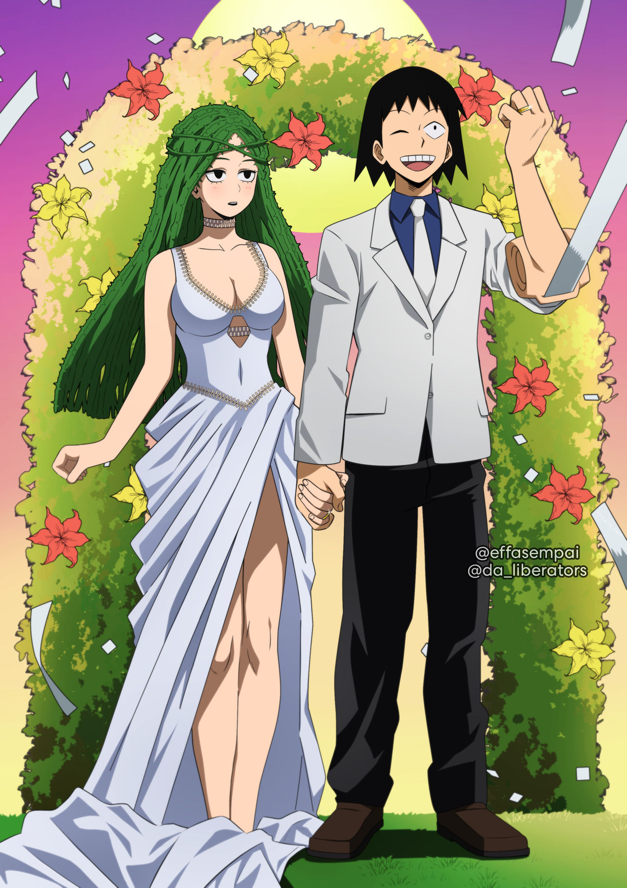 1boy 1girl blush boku_no_hero_academia dress effasempai green_hair highres legs sero_hanta shiozaki_ibara wedding wedding_dress