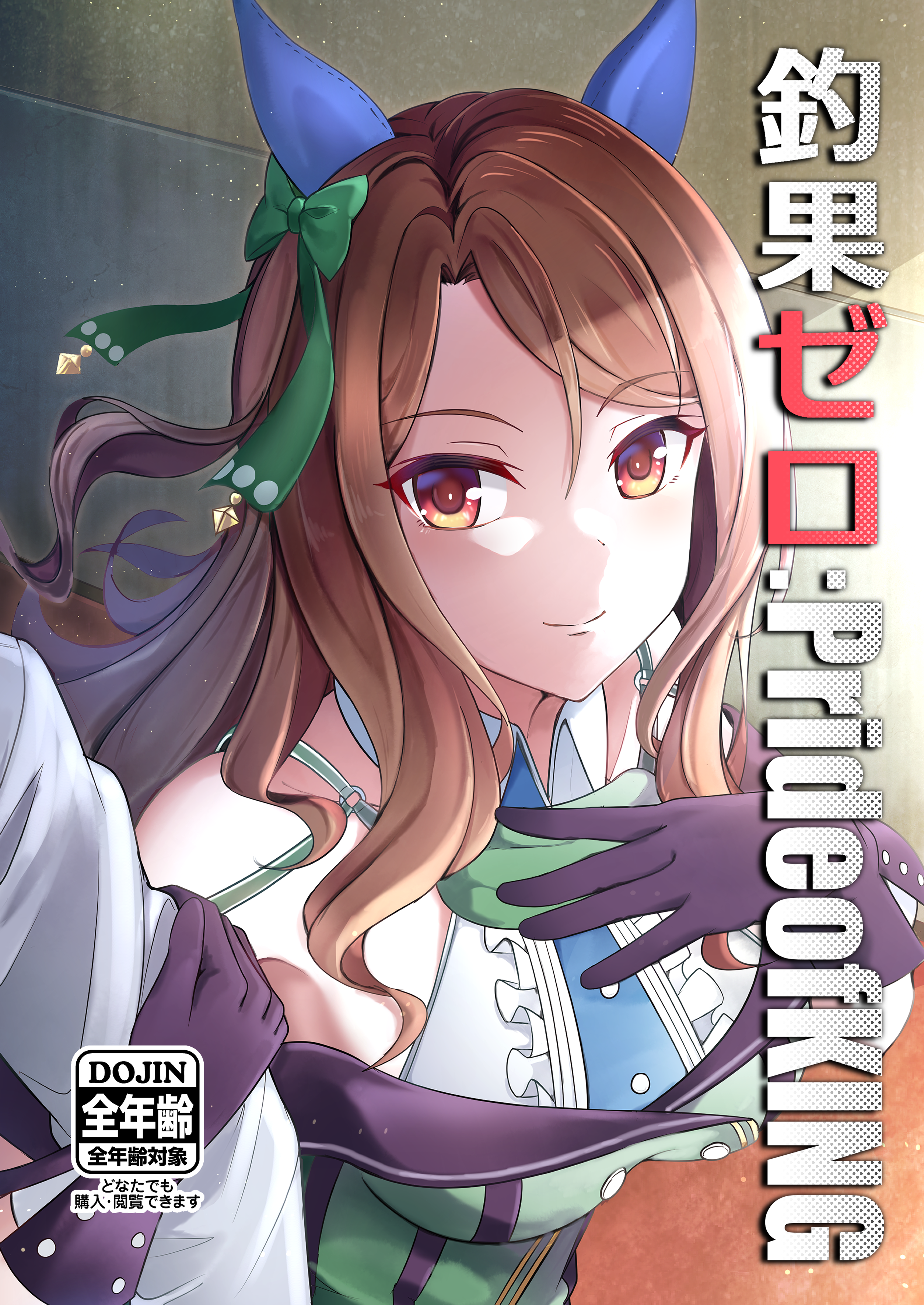 1boy 1girl absurdres animal_ears arm_hug black_gloves bow brown_hair center_frills closed_mouth collared_dress commentary_request cover cover_page doujin_cover dress ear_covers frills gloves green_bow green_dress hair_bow hand_on_own_chest highres horse_ears horse_girl king_halo_(umamusume) long_hair looking_at_viewer off-shoulder_dress off_shoulder red_eyes short_sleeves smile swept_bangs translation_request umamusume zenrakishi