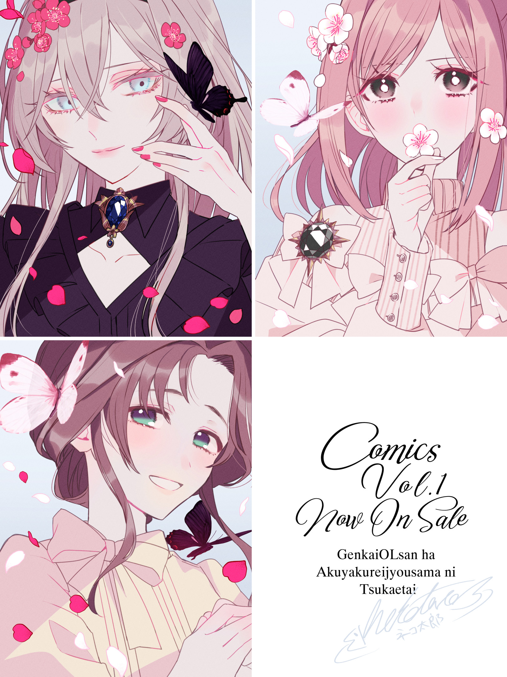 3girls black_gem blue_eyes blue_gem bow bowtie brown_eyes brown_hair bug butterfly butterfly_on_head buttons cleavage_cutout clothing_cutout diana_(akutsuka) english_text fingernails flower gem genkai_ol-san_wa_akuyaku_reijou-sama_ni_tsukaetai green_eyes hair_flower hair_ornament highres insect lapis_tenebrae light_brown_hair multiple_girls nail_polish natori_midori pink_hair shinonome_neko-tarou signature