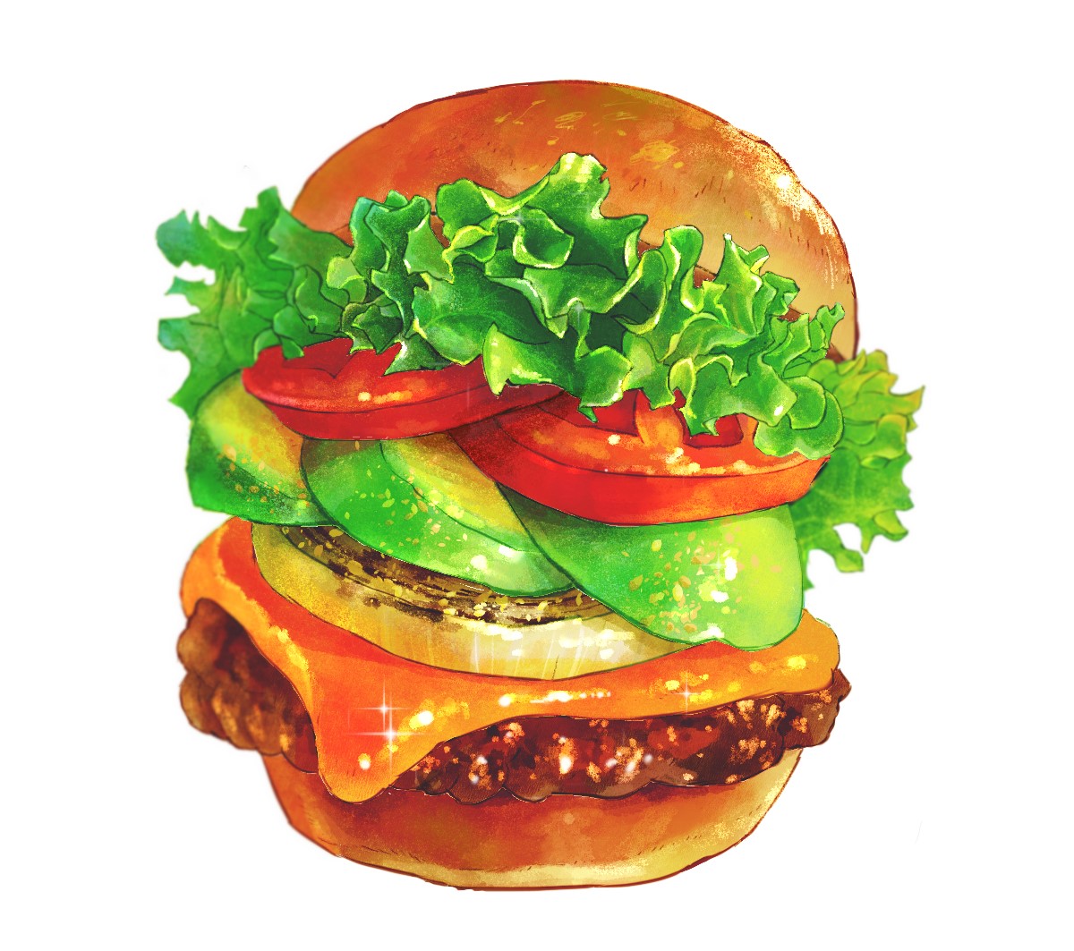 bun_(food) burger butayaro1 cheese food food_focus lettuce meat no_humans original shadow simple_background sparkle still_life tomato tomato_slice white_background