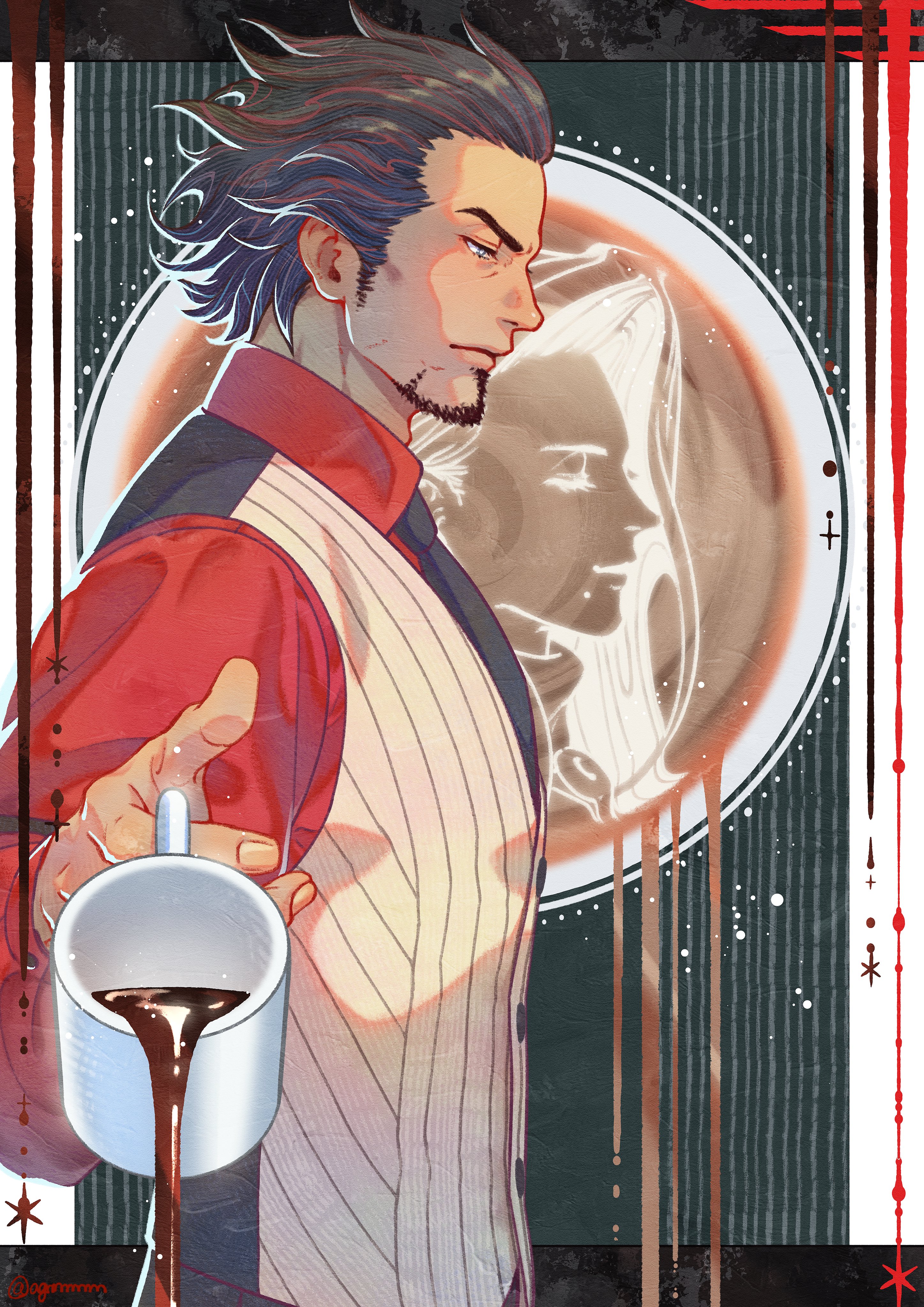 1boy absurdres ace_attorney black_necktie brown_hair closed_mouth coffee_mug collared_shirt cup diego_armando facial_hair from_side hasekou_g highres holding holding_cup latte_art long_sleeves male_focus mia_fey mug necktie profile red_shirt shirt short_hair sideburns smile solo spilling stubble upper_body vest white_vest