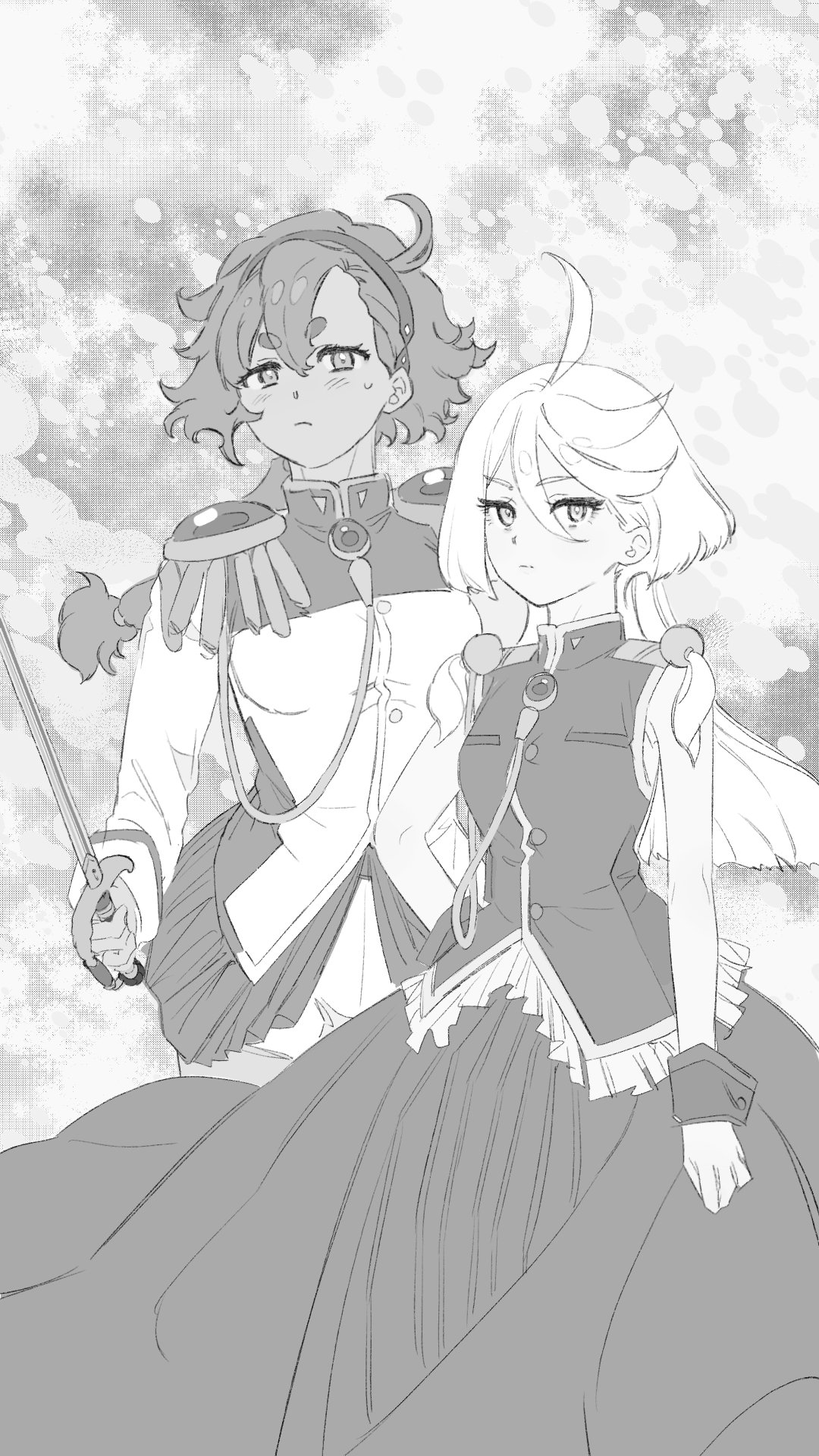 2girls ahoge aiguillette closed_mouth cosplay dress epaulettes gloomymato greyscale gundam gundam_suisei_no_majo hair_between_eyes hairband highres himemiya_anthy himemiya_anthy_(cosplay) holding holding_sword holding_weapon jacket long_hair long_sleeves looking_at_viewer miorine_rembran monochrome multiple_girls rapier shorts shoujo_kakumei_utena suletta_mercury sweatdrop sword sword_of_dios tenjou_utena tenjou_utena_(cosplay) thick_eyebrows weapon wrist_cuffs