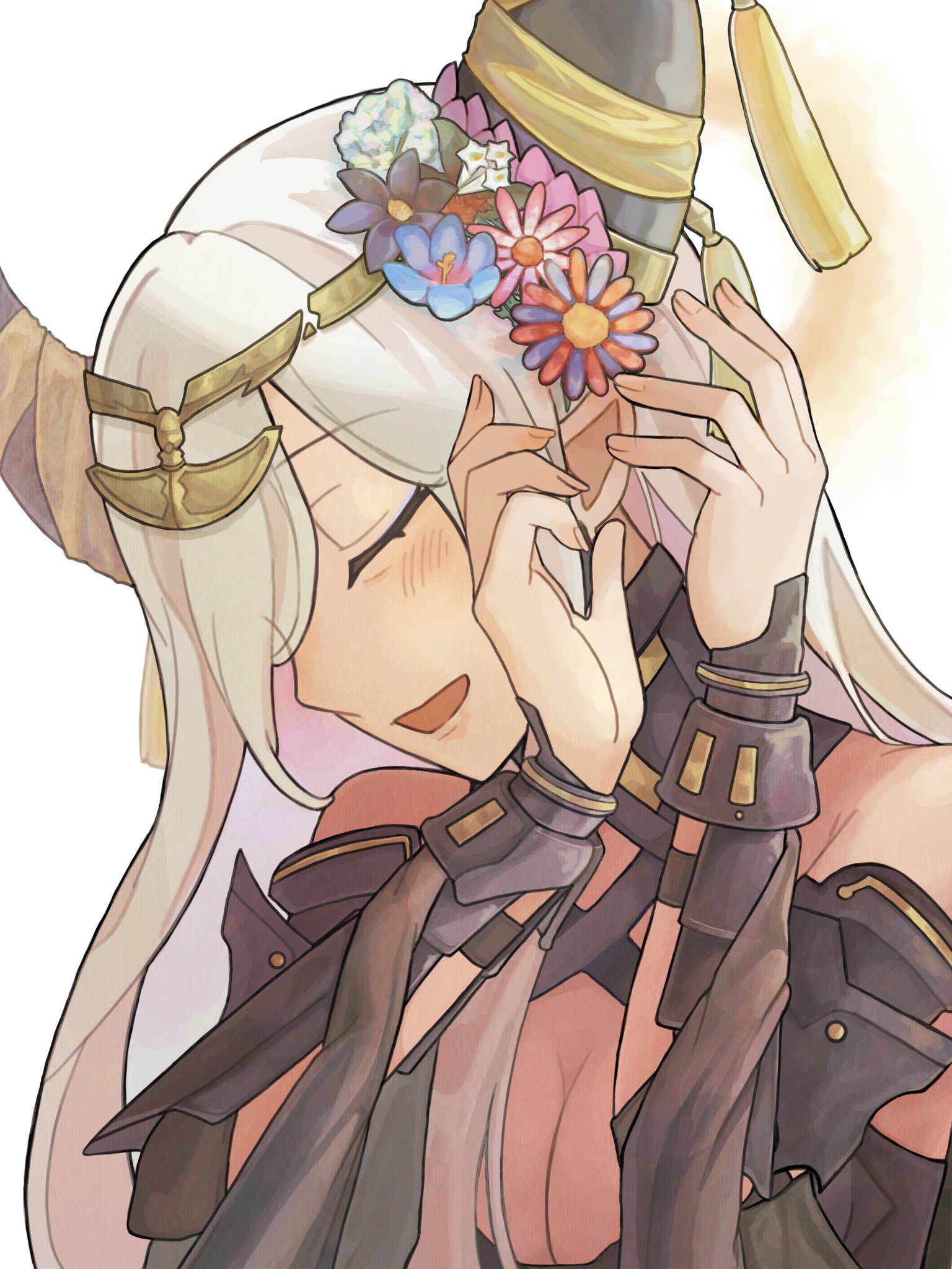 bare_shoulders blonde_hair closed_eyes dark_skin fire_emblem fire_emblem_engage flower hair_between_eyes highres horns jewelry kans0u55 long_hair mature_female monster_girl nintendo portrait revealing_clothes smile tagme zelestia_(fire_emblem)