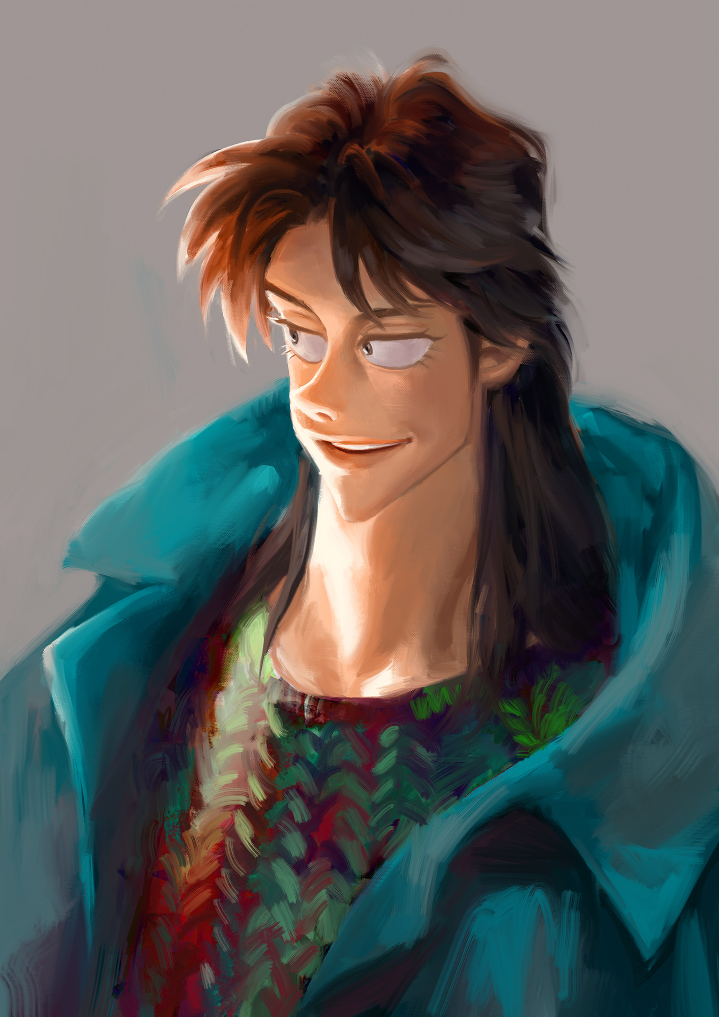 1boy aqua_coat brown_eyes brown_hair coat eyelashes grey_background highres ichijou_seiya tobaku_mokushiroku_kaiji looking_to_the_side male_focus medium_hair multicolored_clothes open_mouth shishinnonoii smile smirk solo_focus sweater teeth upper_body upper_teeth_only