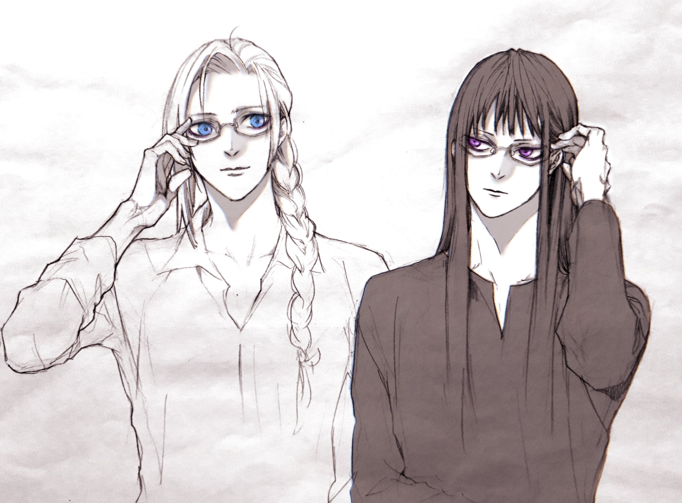 2boys adjusting_eyewear arthur_beresford bespectacled blue_eyes braid collared_shirt csanaca glasses hair_over_shoulder hand_up harrison_dirk higeki_no_genkyou_tonaru_saikyou_gedou_last_boss_joou_wa_tami_no_tame_ni_tsukushimasu highres long_hair long_sleeves looking_at_another looking_at_viewer male_focus monochrome multiple_boys purple_eyes shirt simple_background single_braid smile spot_color straight_hair traditional_media upper_body