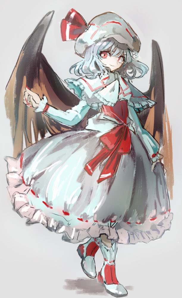 1girl bat_wings black_wings capelet closed_mouth commentary_request curiosities_of_lotus_asia dress grey_background grey_hair hair_ribbon long_sleeves looking_at_viewer nanataru10 official_alternate_costume one-hour_drawing_challenge red_eyes red_ribbon remilia_scarlet ribbon ribbon-trimmed_skirt ribbon_trim short_hair simple_background socks solo touhou white_capelet white_dress white_headwear white_socks wings