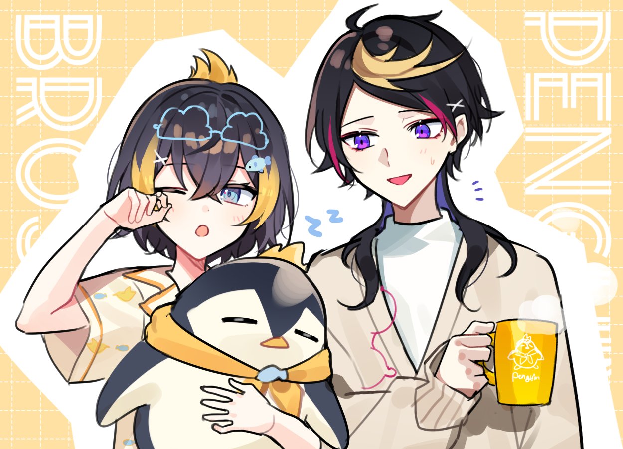 1boy 1girl black_hair blonde_hair blue_eyes brown_hair commentary cup drawn_eyewear english_commentary eyeshadow hair_ornament holding holding_cup long_hair makeup mug multicolored_hair nijisanji nijisanji_en one_eye_closed open_mouth pajamas petra_gurin pink_hair purple_eyes purple_hair red_eyeshadow short_hair short_sleeves shu_yamino streaked_hair stuffed_animal stuffed_penguin stuffed_toy virtual_youtuber waka_(wk4444) x_hair_ornament yawning