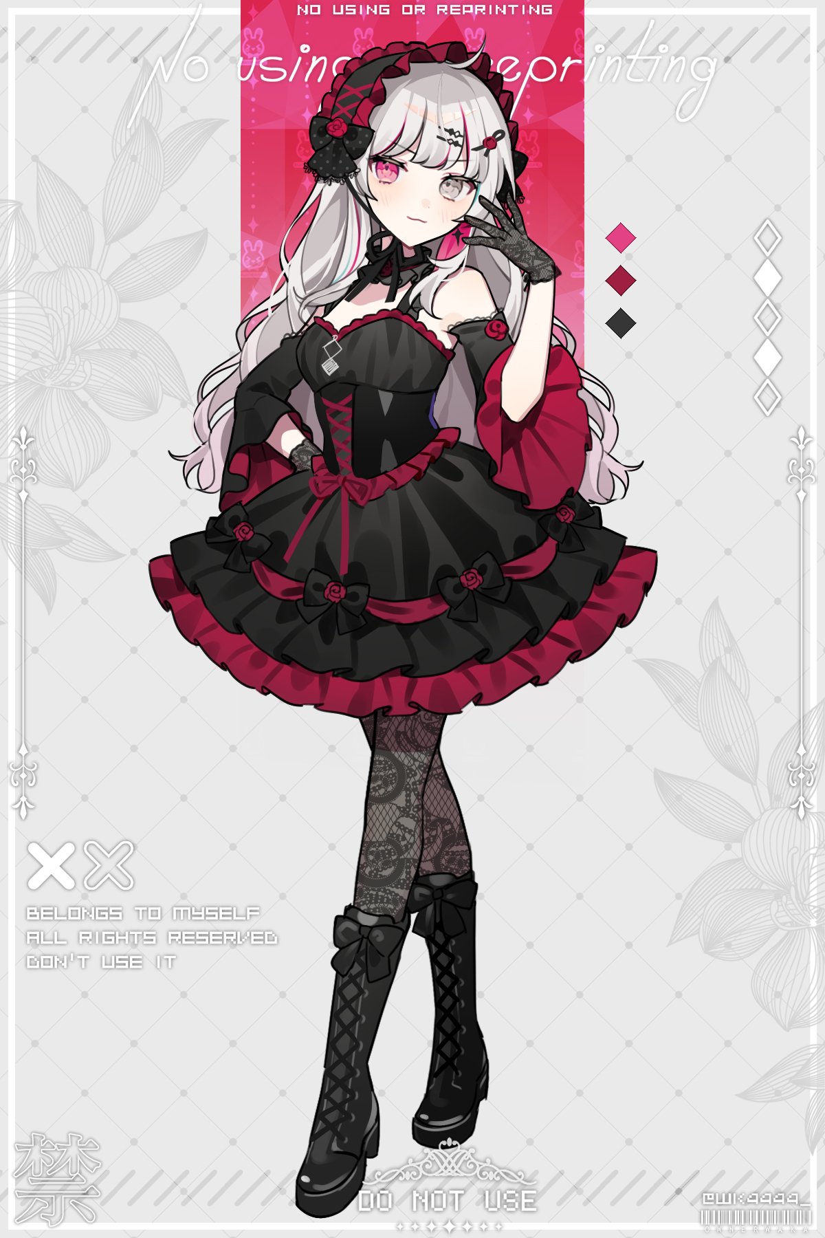 1girl black_boots black_corset black_dress black_gloves boots bow corset detached_sleeves dress dress_bow frilled_dress frills full_body gloves gothic_lolita gradient_hair grey_eyes grey_hair hair_ornament hairclip headdress heterochromia highres ishigami_nozomi lace lace-up_boots lace_gloves lace_pantyhose lace_thighhighs lolita_fashion long_hair multicolored_hair nijisanji pantyhose pink_eyes solo thighhighs virtual_youtuber waka_(wk4444) white_hair