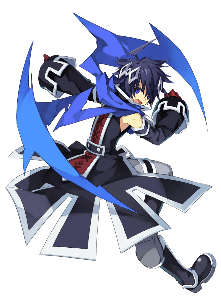 1boy ahoge black_boots black_hair blue_eyes blue_scarf boots detached_sleeves full_body gloves highres lucius_(trinity_universe) male_focus official_art open_mouth red_gloves scarf solo transparent_background trinity_universe tsunako