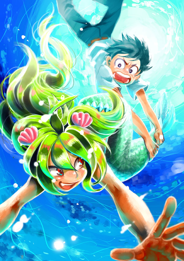 1boy 1girl belt brown_belt denim fang green_hair green_tail grey_hair hair_ornament jeans katou_(hyaena) long_hair mermaid monster_girl mukoujima_takurou muromi-san namiuchigiwa_no_muromi-san open_mouth outstretched_arms pants red_eyes scales shell shell_hair_ornament shirt short_hair short_sleeves tail tail_grab tears teeth underwater white_shirt