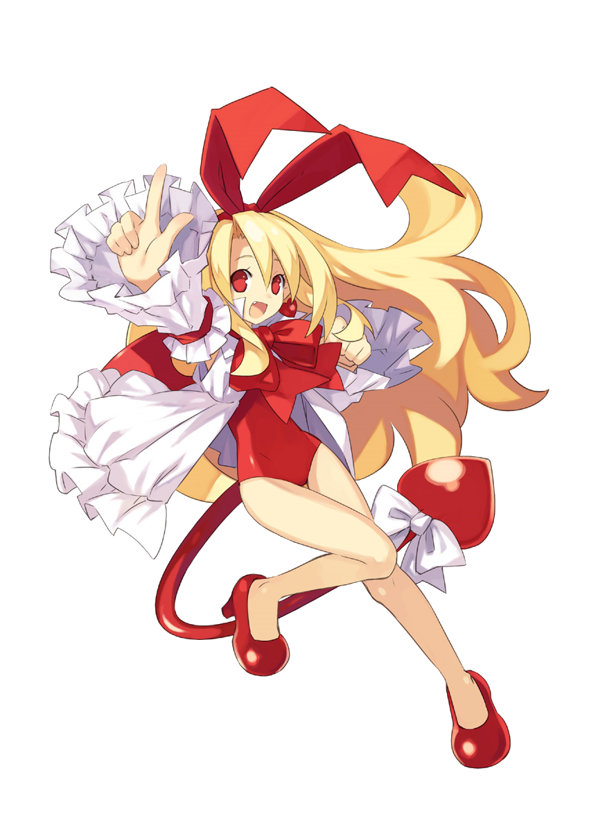 1girl blonde_hair bow demon_tail disgaea dress fallen_angel flonne flonne_(fallen_angel) full_body hair_bow highres index_finger_raised legs long_hair long_sleeves official_art open_mouth red_eyes red_footwear solo tail transparent_background trinity_universe tsunako