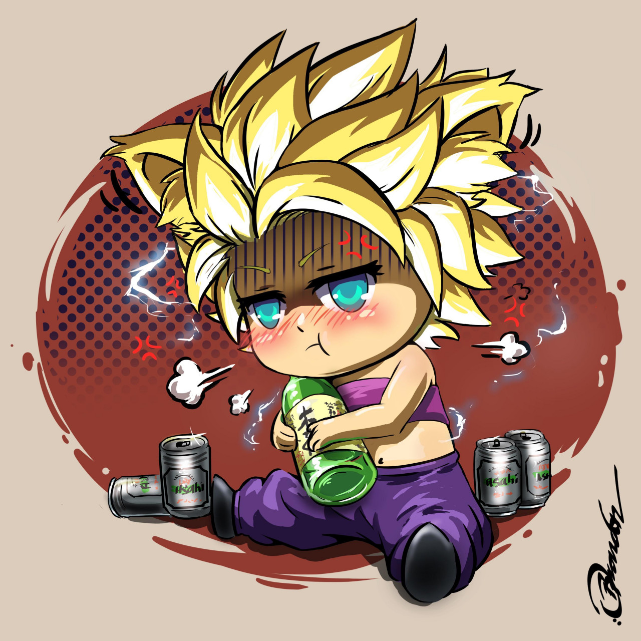 1girl alcohol animal_ears bad_furaffinity_link bad_link blonde_hair blue_eyes blush cat_ears caulifla chibi clothes dragon_ball dragon_ball_super highres looking_at_viewer pants purple_pants purple_tube_top solo strapless super_saiyan sweatpants tube_top