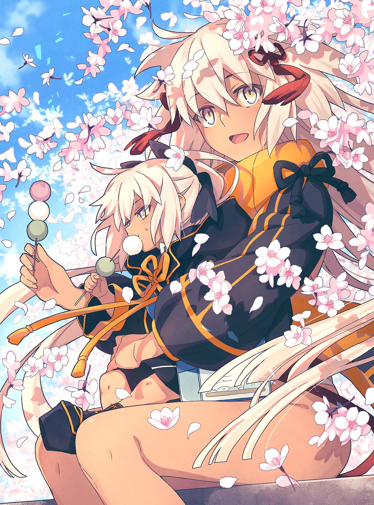2girls ahoge black_jacket cropped_jacket dango dark-skinned_female dark_skin fate/grand_order fate_(series) food grey_eyes highres jacket koha-ace long_hair long_sleeves looking_at_viewer multiple_girls okita_souji_(fate) okita_souji_alter_(fate) okita_souji_alter_(swimsuit_saber)_(fate) okita_souji_alter_(swimsuit_saber)_(first_ascension)_(fate) orange_scarf rengoku_(fate) rengoku_(first_ascension)_(fate) saipaco sanshoku_dango scarf shrug_(clothing) smile very_long_hair wagashi white_hair
