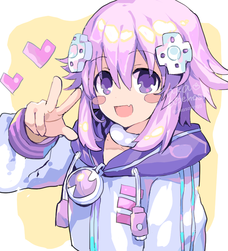 1girl akasanngg blush choker d-pad d-pad_hair_ornament hair_between_eyes hair_ornament hood hood_down hooded_jacket hooded_track_jacket jacket long_sleeves looking_at_viewer medium_hair neptune_(neptunia) neptune_(series) open_mouth purple_eyes purple_hair solo track_jacket upper_body white_jacket