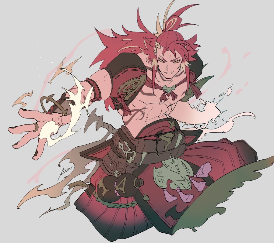 1boy b_exjo2 belt blonde_hair clenched_hand closed_mouth fang fire gourd granblue_fantasy grey_background long_hair looking_at_viewer male_focus multicolored_hair muscular muscular_male outstretched_arm red_eyes red_hair smile solo wilnas_(granblue_fantasy)