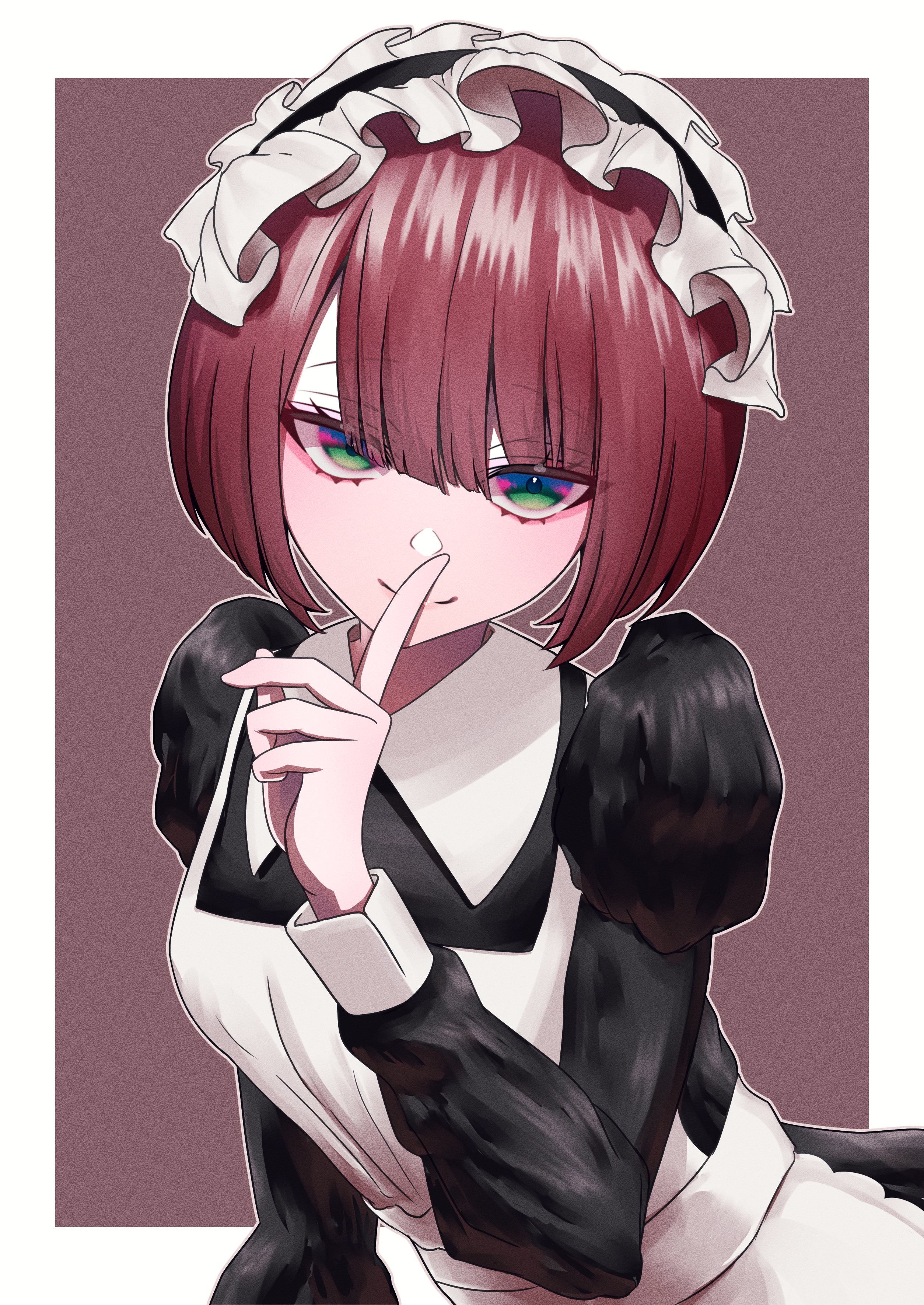 1girl absurdres apron black_dress black_hairband blunt_bangs border breasts brown_background closed_mouth commentary commission dress eyelashes finger_to_mouth frilled_hairband frills green_eyes hair_over_eyes hairband hand_up head_tilt highres index_finger_raised juliet_sleeves kitsutsuki_tsuki leaning_forward long_bangs long_sleeves looking_at_viewer maid maid_apron maid_headdress medium_breasts multicolored_eyes narrowed_eyes original outside_border pink_eyes puffy_sleeves raised_eyebrows red_hair short_hair shushing simple_background skeb_commission smile solo two-tone_eyes upper_body upturned_eyes white_apron white_border white_hairband