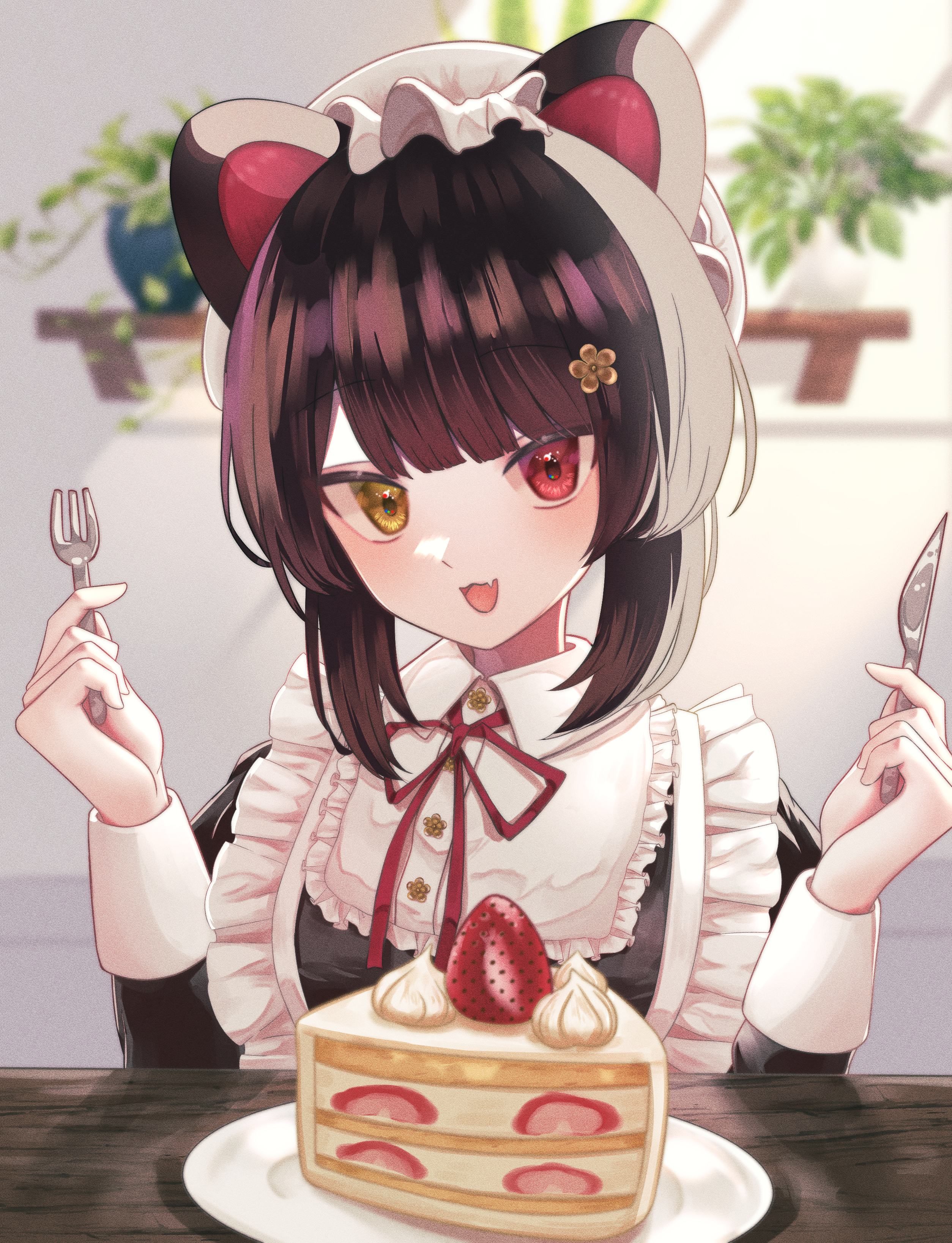 1girl :3 :d absurdres animal_ears apron arms_up black_dress black_hair blunt_bangs blurry blurry_background butter_knife cake cake_slice commentary depth_of_field dog_ears dog_girl dress fang film_grain flower food fork frilled_apron frills fruit hair_flower hair_ornament hair_up hat heterochromia highres holding holding_fork holding_knife indoors inui_toko kitsutsuki_tsuki knife light_rays long_sleeves looking_at_viewer maid mob_cap neck_ribbon nijisanji open_mouth plant plate potted_plant puffy_sleeves red_eyes red_ribbon ribbon sidelocks smile solo strawberry strawberry_shortcake sunbeam sunlight table upper_body virtual_youtuber w_arms white_apron