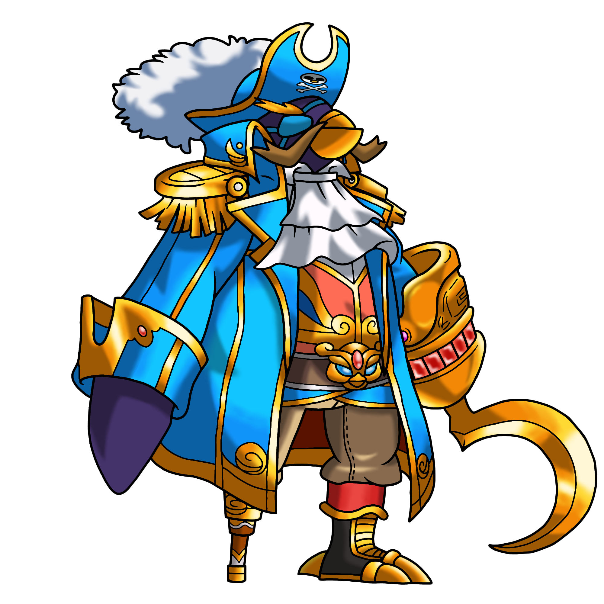 animal ascot belt_buckle bird blue_headwear brown_pants buckle epaulettes eyepatch facial_hair gigamomantai highres hook_hand mustache pants peg_leg penguin pirate_costume skull_and_crossbones standing vest white_ascot