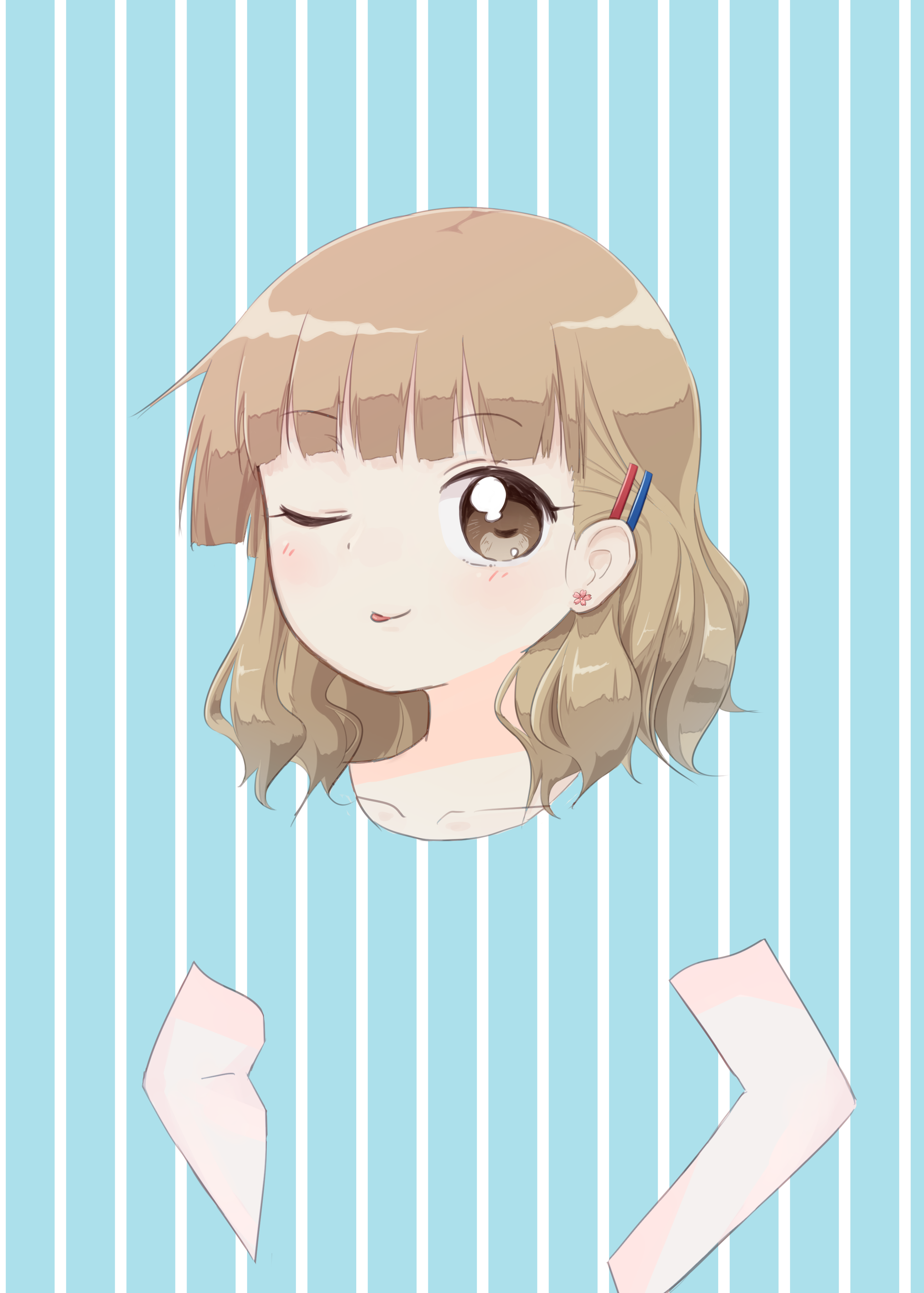 1girl absurdres blonde_hair brown_eyes earrings flower_earrings hair_ornament hairclip hands_on_own_hips highres jewelry medium_hair one_eye_closed oomuro_sakurako parallel_hairclips potoio simple_background solo striped tongue tongue_out vertical_stripes yuruyuri