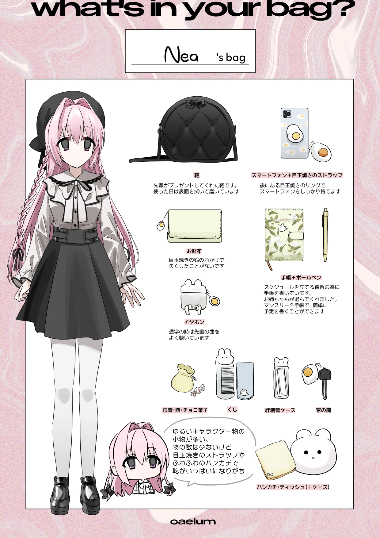 1girl bag beret black_footwear black_headwear black_ribbon black_skirt bow candy candy_wrapper cellphone cellphone_charm character_name charm_(object) chibi chibi_inset chihuri comb commentary_request cropped_torso english_text equipment_layout food hair_between_eyes hair_intakes hair_ribbon handbag hat highres key long_sleeves multiple_views nea_(chihuri) original pantyhose pencil phone pink_hair pleated_skirt puffy_long_sleeves puffy_sleeves purple_eyes ribbon shirt shoes skirt sleeves_past_wrists speech_bubble translation_request white_bow white_pantyhose white_shirt wrapped_candy