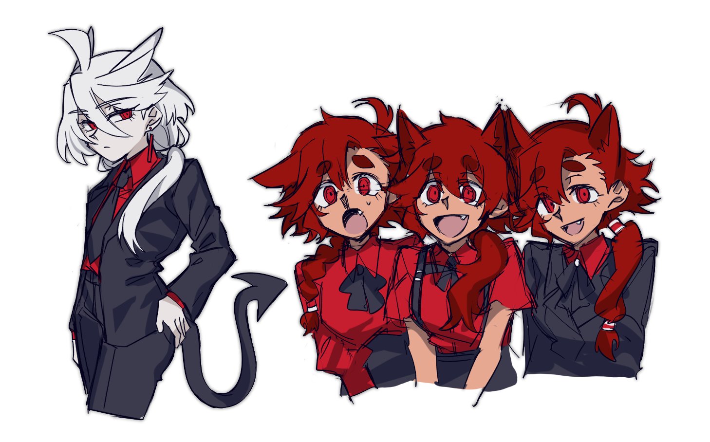 2girls :d adapted_costume ahoge animal_ears black_jacket black_necktie black_ribbon braid cerberus_(helltaker) cerberus_(helltaker)_(cosplay) closed_mouth collared_shirt cosplay cosplay_request cropped_legs dark_skin demon_girl demon_horns demon_tail earrings eyes_visible_through_hair fang formal_clothes gundam gundam_suisei_no_majo hair_between_eyes hair_over_shoulder hand_on_own_hip helltaker horns jacket jewelry long_hair long_sleeves looking_at_viewer miorine_rembran morumottokun multiple_girls neck_ribbon necktie open_mouth pale_skin pants ponytail red_eyes red_hair red_shirt ribbon shirt short_eyebrows sideways_glance simple_background single_braid smile suit suletta_mercury suspenders sweat tail thick_eyebrows vanripper_(style) white_background white_hair
